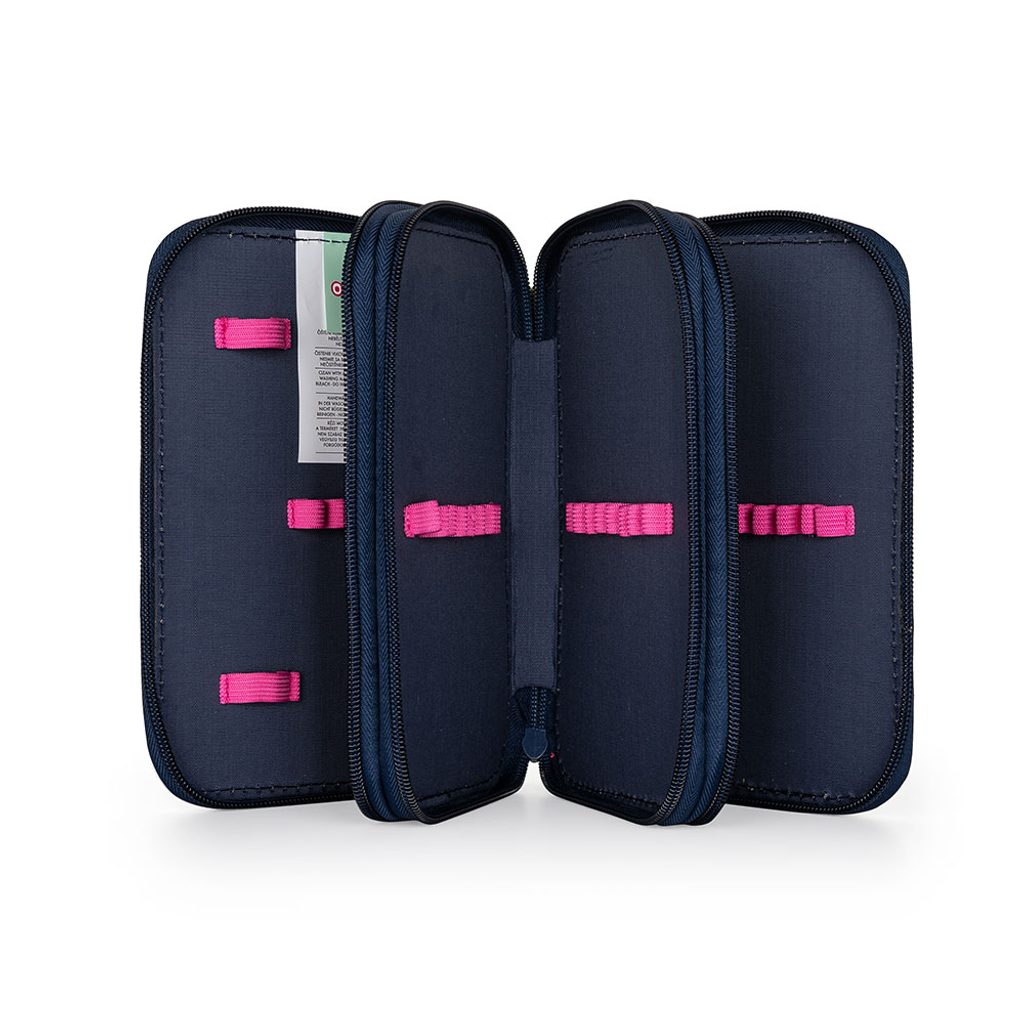 Školní penál třípatrový bez náplně. Penál obsahuje 40 gumových poutek pro uložení všech psacích potřeb a drobností potřebných k výuce. Penál má pevný zip s velkými taháčky pro snadnou manipulaci. Jedno patro je opatřeno průhlednou přihrádkou pro týdenní rozvrh.