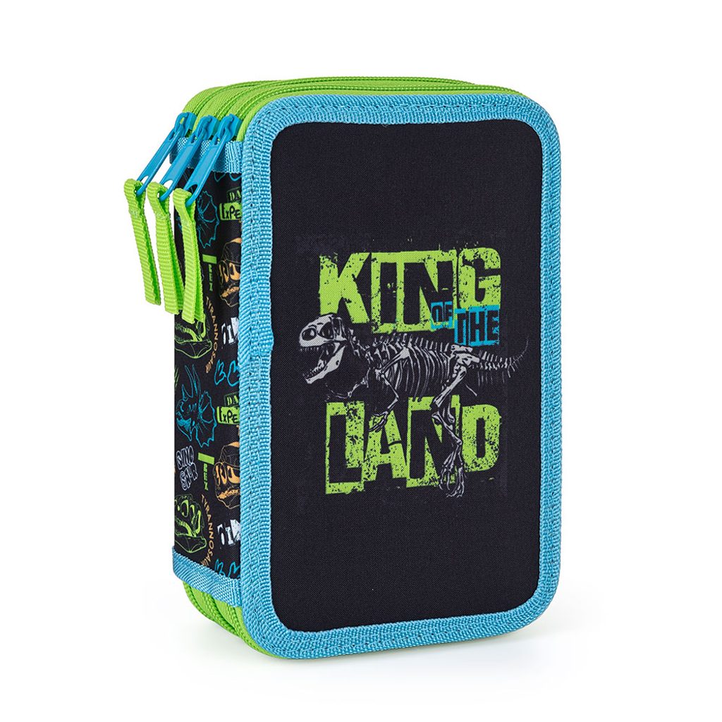 Školní penál třípatrový bez náplně. Penál obsahuje 40 gumových poutek pro uložení všech psacích potřeb a drobností potřebných k výuce. Penál má pevný zip s velkými taháčky pro snadnou manipulaci. Jedno patro je opatřeno průhlednou přihrádkou pro týdenní rozvrh.