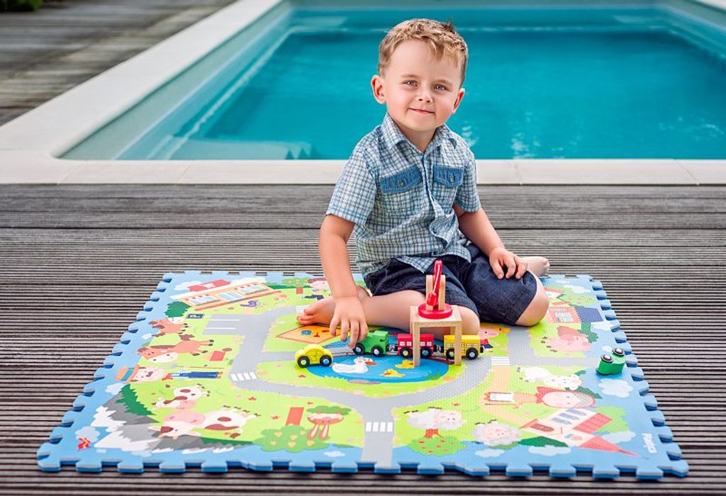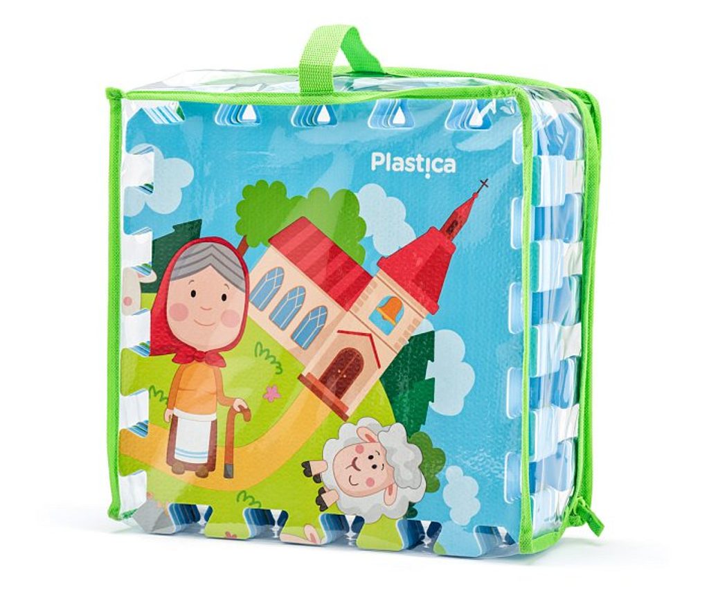 Pěnové puzzle s motivem vesnice bylo vytvořeno v dílně českých návrhářů. Slouží jako hračka, podložka na hraní i pro odpočinek.