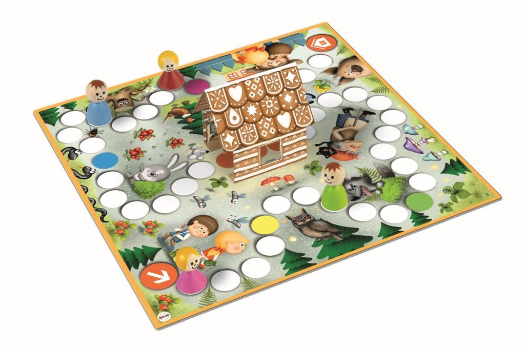 Malebná hrací deska je doplněna o 3D chaloupku. Součástí balení jsou dva Jeníčcci a dvě Mařenky.