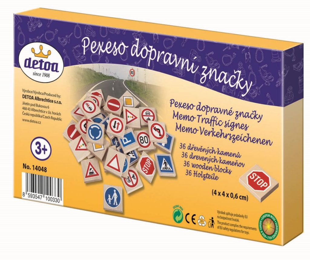 Zábavné poznávání obrázků dopravních značek. Napomůže zdokonalovat znalost dopravních značek a zároveň, si zahrát pexeso. Velikost dřevěných kartiček 165x125x15mm. Balení obsahuje 36 dílků.