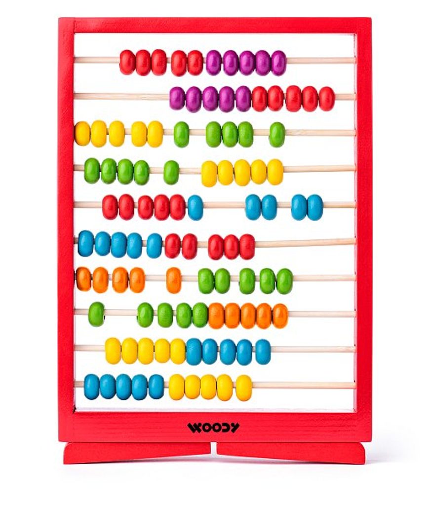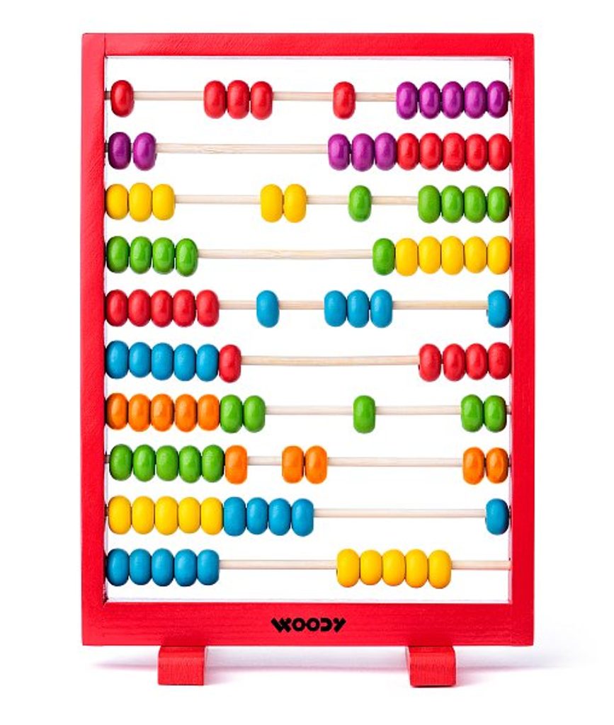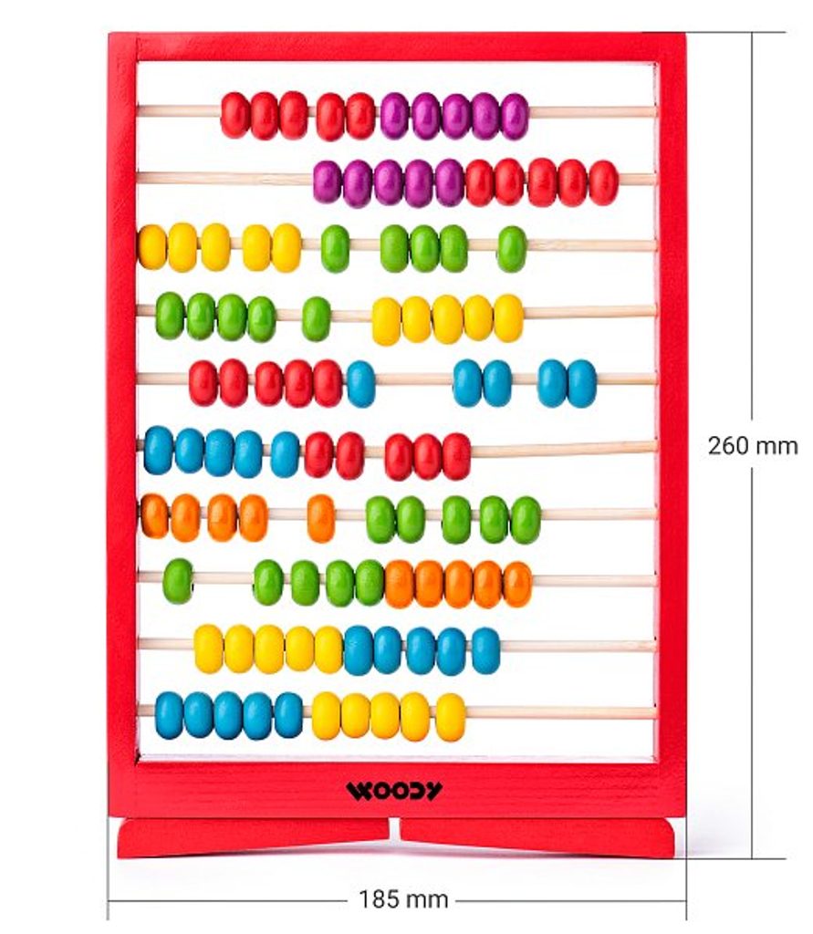 Dřevěné počítadlo v červeném rámu. Na 10 tyčkách je navlečeno celkem 100 ks kuliček, které jsou roztříděné po pěti. Hračka je výbornou pomůčkou pro děti, které se začínají učit počítat. Rozměr: 18,5 x 8,5 x 26cm Věková kategorie: 3 +