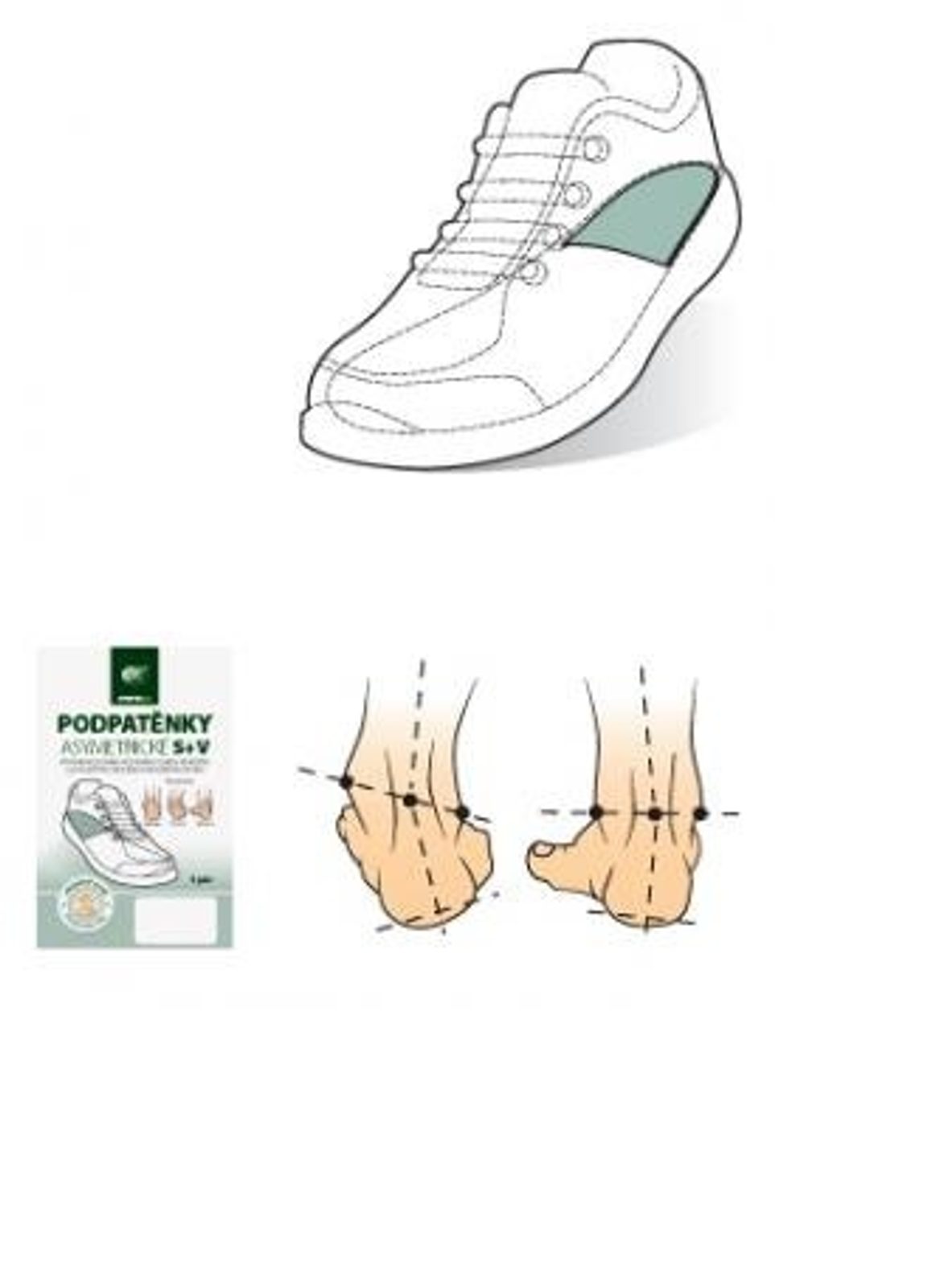 Pro správný anatomický tvar nohy je velmi důležité postavení patní kosti vzhledem k ose dolní končetiny. Správné postavení patní kosti je takové, kdy její osa je kolmo k podložce. Toto postavení zajišťuje rovnoměrně napětí svalů nohy, správné uspořádání klenby nožní a brání přetížení jednotlivých oblouků klenby. Podpatěnka asymetrická je vyrobena ze šlehaného latexu, který je zárukou odolnosti vůči deformačním vlivům. Povrch podpatěnky je překryt měkkou jehněčí usní. Jeden pár podpatěnek lze vhodnou aplikací použit pro vbočené i vybočené vychýlení osy dolní končetiny. Kvalitní samolepicí fólie zajistí podpatěnku proti posunu.