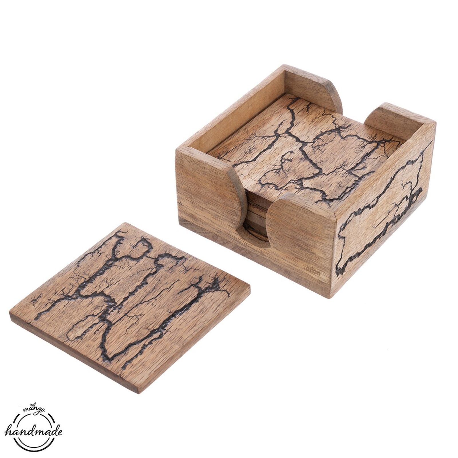 Stojan se šesti podtácky z kolekce MANGO electric oživí vaši domácnost a dodá interiéru originální šmrnc. Jedná se o designový, ale zároveň praktický kousek. Každý kus je výsledkem ruční výroby, a proto se může mírně lišit, což z něj činí jedinečný a osobitý doplněk. Není vhodný do myčky na nádobí. Materiál: mangové dřevo. Rozměry: stojan cca 11,5x11,5x6 cm, podtácek cca 10x10x0,7 cm.