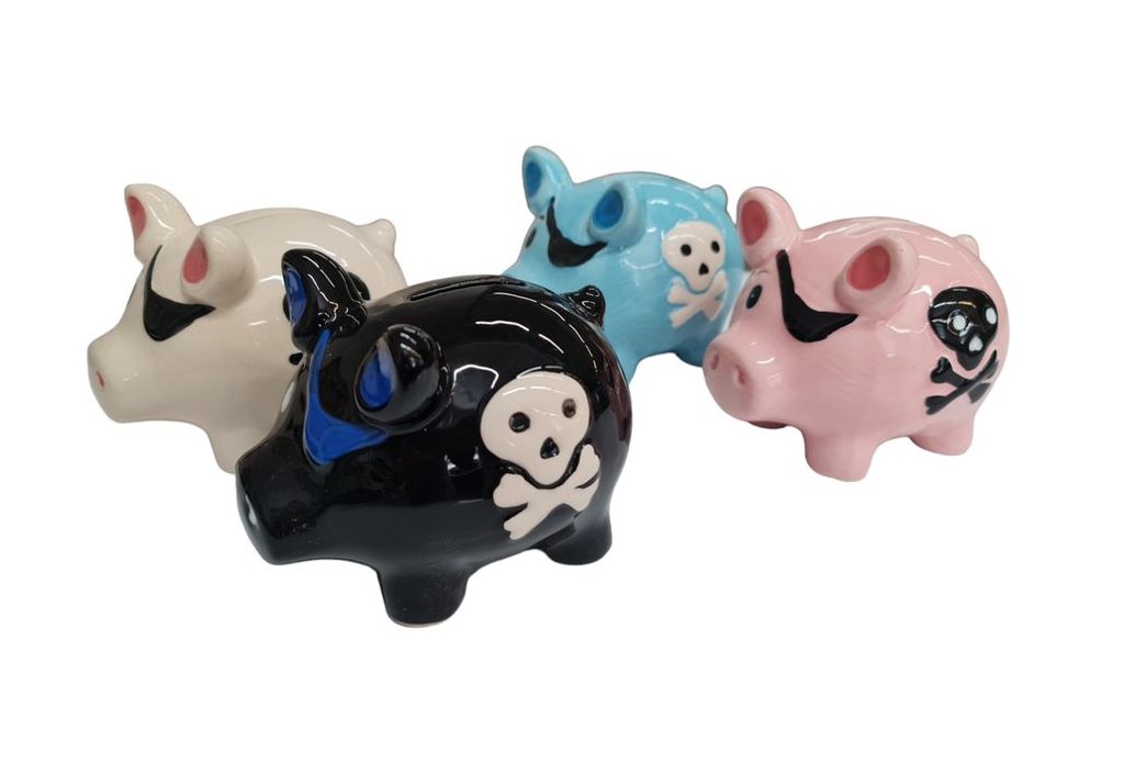 pokladnička PRASÁTKO-PIRÁT, 12x9,5x9,5cm, 4bar.,otvír.,keram.