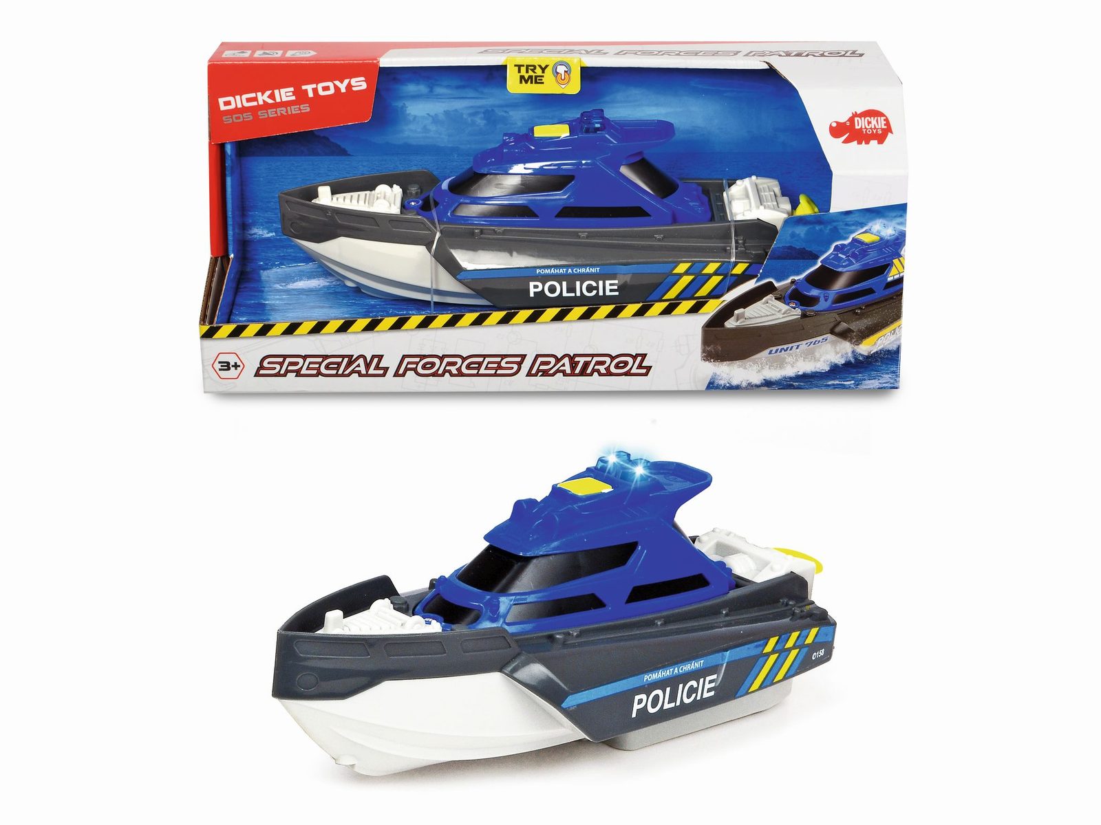 Policejní loď se světelnými a zvukovými efekty, natahování na šňůrku. Velikost 24 cm, měřítko 1:24. Česká verze.