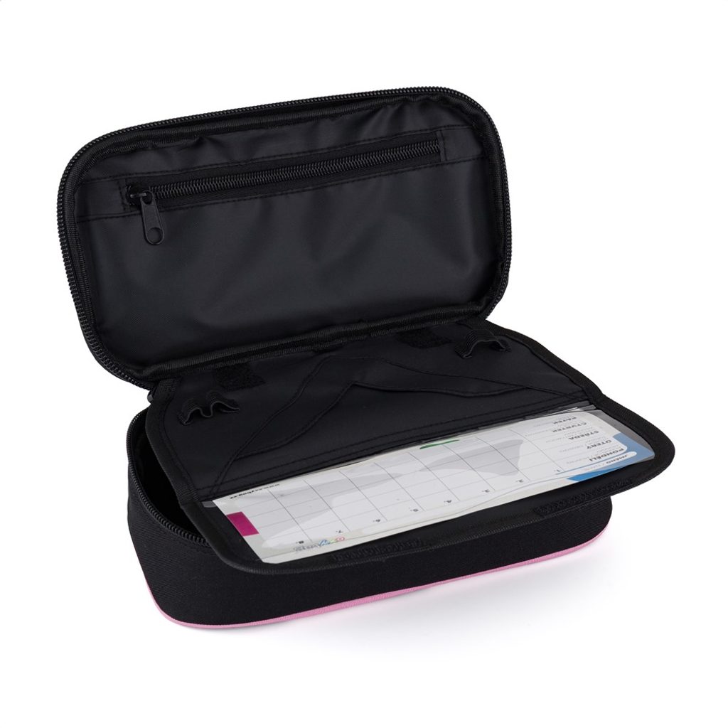 Školní pouzdro je opatřeno pevnými zipy, uzavíratelnou kapsičkou na zip, přihrádkou na pravítko a klopou s šesti poutky na psací potřeby. Pod klopou je místo pro volné uložení psacích potřeb nebo jiných drobností. Vhodné pro školáky na 2. stupni a starší studenty.