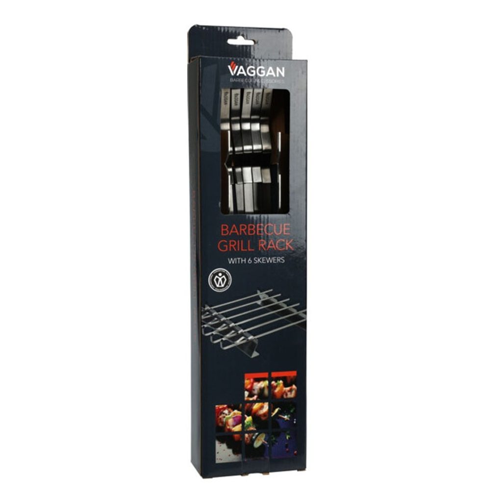 PROGARDEN Grilovací stojan se špízy 6 ks KO-C83501030 bbq špízová sada 6 kusů se 2 držáky, špízy: rozměr 425x102xtloušťka 1,8mm, hmotnost 34 gramů, držák: rozměr 360xh56mm, tloušťka 2mm, hmotnost 332 gramů, celková hmotnost sady 1362 gramů, materiál nerezová ocel 430. každá sada v polootevřené barevné krabičce, umělecké dílo vaggan