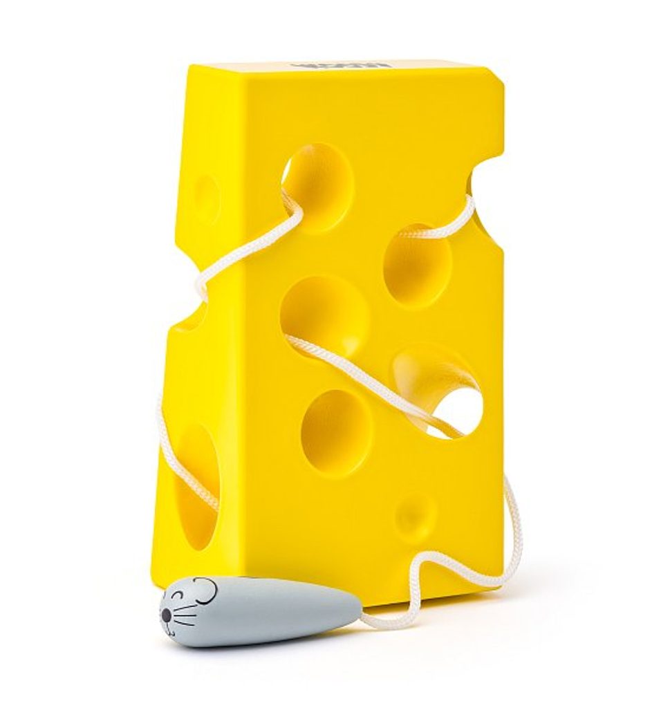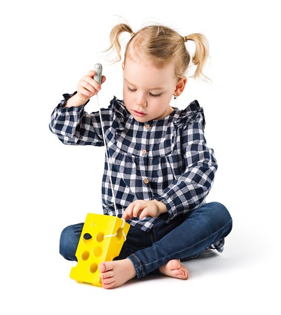 Motor play for the smallest. The child threads the small mouse through the perforated cheese and trains fine motor skills by that.
