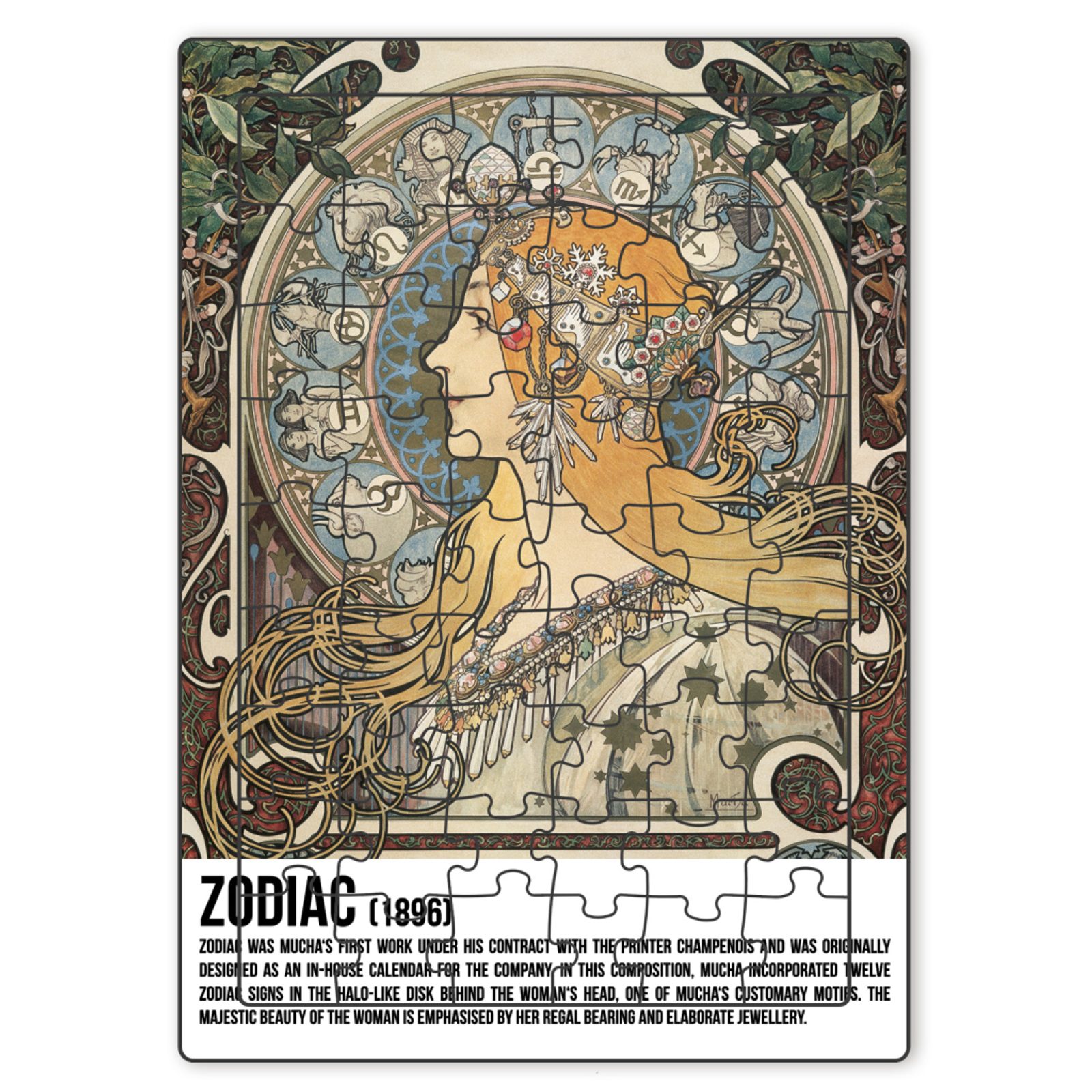 Puzzle ve formátu A4 s obrazem Zodiac malíře Alfonse Muchy.