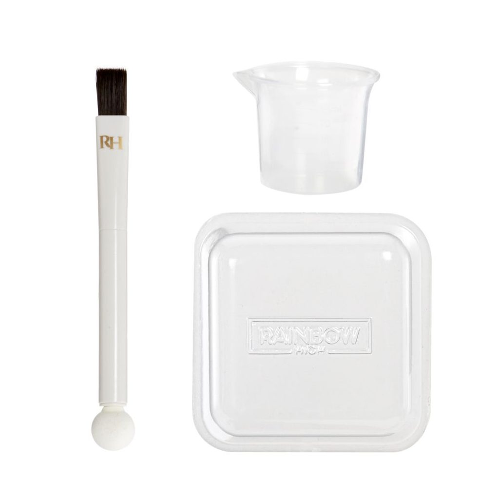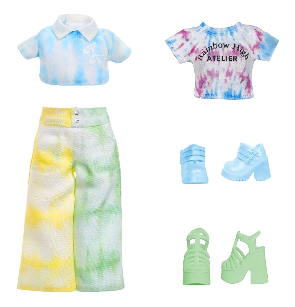• barevnách prášků a další doplňky k barvení oblečení a vlasů Udělejte si svou vlastní Rainbow High panenku! V balení najdeš panenku s bílými vlasy oblečenou od hlavy k patě do bílé barvy a 6 smývatelných duhových prášků (červený, oranžový, žlutý, zelený, modrý a fialový), gumičky k batikování a aplikační houbičku. Existuje nekonečně mnoho způsobů, jak vybarvit oblečení panenky nebo její vlasy. Po dokončení můžeš panenku opláchnout a vybarvit ji úplně jinak. Prášek nasypeš do vody. Do barevné vody můžeš namočit vlasy a oblečení, nebo houbičku, kterou budeš vytvářet vzory. Pomocí gumiček svaž oblečení a vytvářej různě batikovaný outfit.