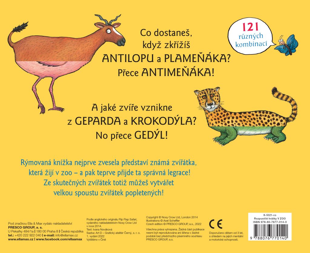 Rýmovaná knížka nejprve představí zvířátka, která žijí v zoologických zahradách – a pak teprve přijde ta správná legrace! Ze skutečných zvířátek totiž můžete vytvářet velkou spoustu zvířátek popletených! Jejich novými neobyčejnými vlastnostmi a roztodivnými jmény se budou bavit nejen malí čtenáři, ale s chutí se nad nimi zasmějí i ti dospělí. Věřili byste, že do jedné malé knížky se vejde o pár desítek více než stovka různých tvorů? Veselé ilustrace mezinárodně oceňovaného autora jsou doplněné původními českými básničkami.