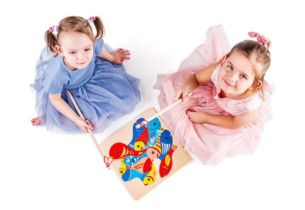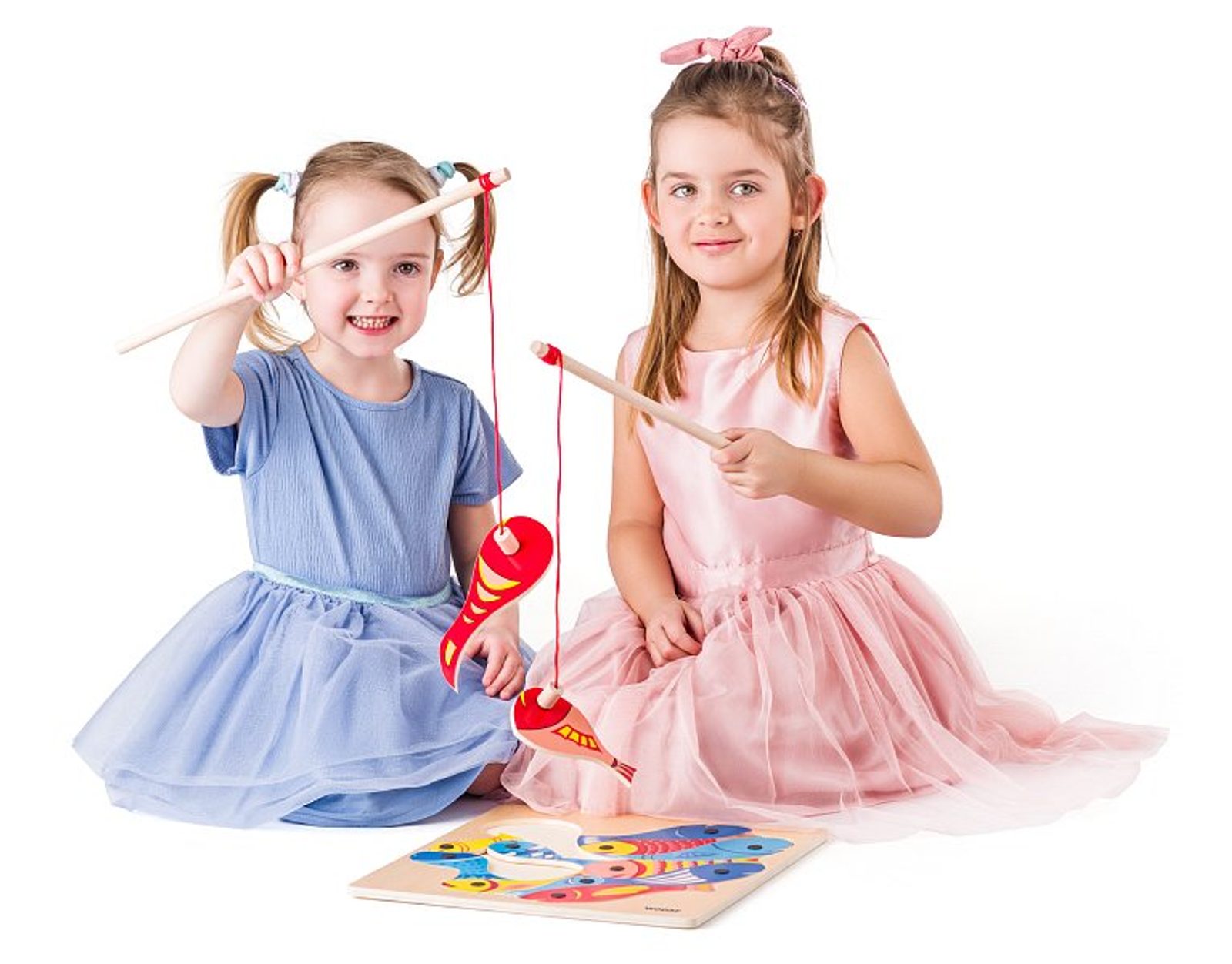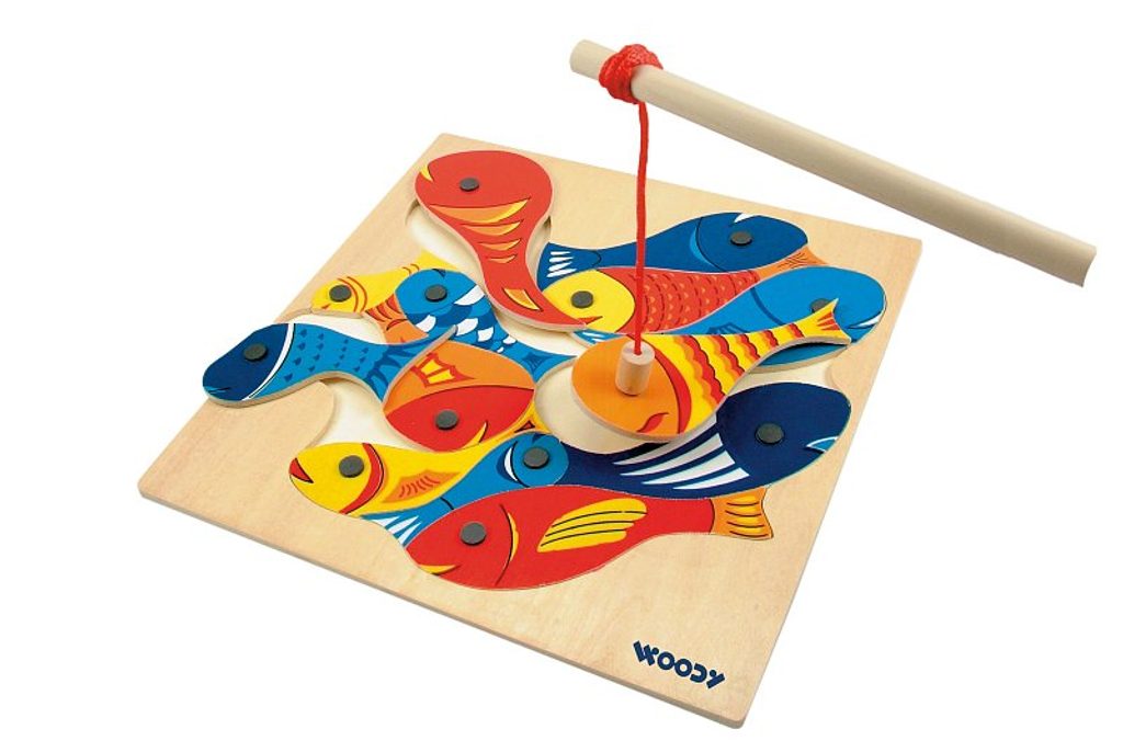 Dřevěný proutek s magnetem zavěšeným na provázku, na který se musí nachytat rybičky. Hra rozvíjí dítě ve dvou fázích. Jednak jde o soutěživou hru, kdo naloví pomocí magnetků připevněných na udičkách více rybiček a jednak vede dítě k přemýšlení, kdy má za úkol složit rybičky tak, aby do sebe znovu zapadaly. | Věk: 2-5 | Rozměr: 31 x 31 x 2 cm, délka prutu: 40cm