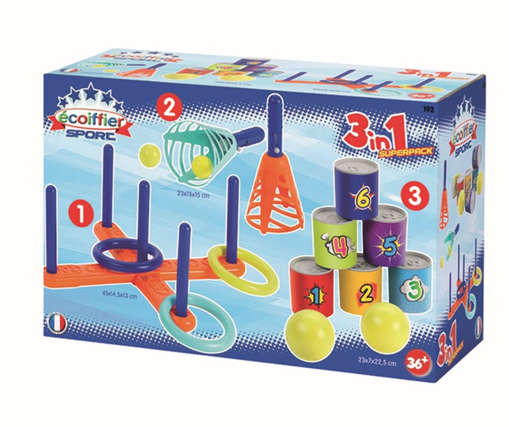 Sada 3 oblíbených her vhodných do interiéru i exteriéru - chyť míček, kroužky na kříž a shazování plechovek. Vše plastové, vyrobeno ve Francii.