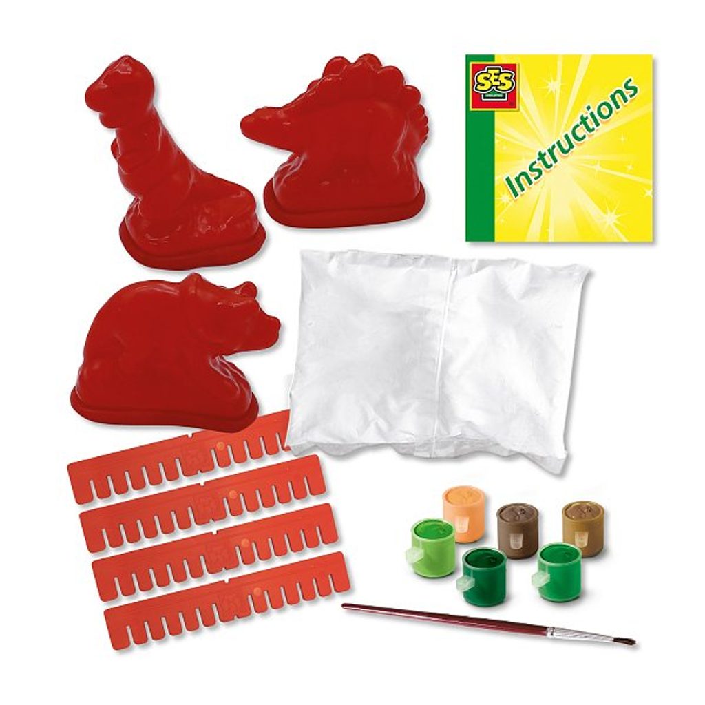 Tři pevné gumové formy na odlévání dokonale propracovaných dinosaurů. Snadná výroba, možno malovat i lakovat . Sada včetně sádry, štětce a temperových barev.