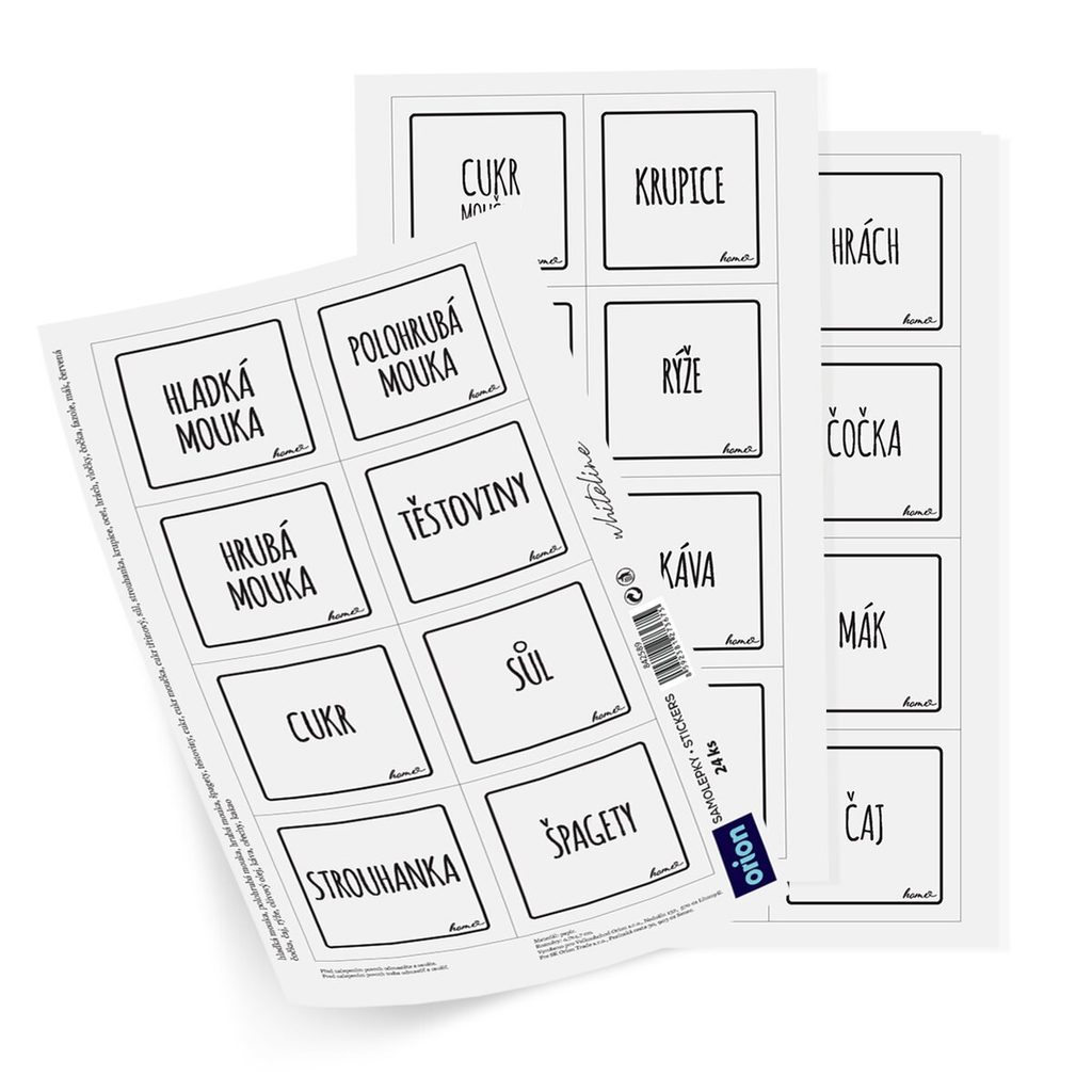 Samolepky s popisky. Čtvercový tvar. 24 samolepek. Bílé. Rozměry: 1 samolepka 4,7x4,7 cm. Lze použít na dózy WHITELINE, na skleněné dózy, kořenky...
