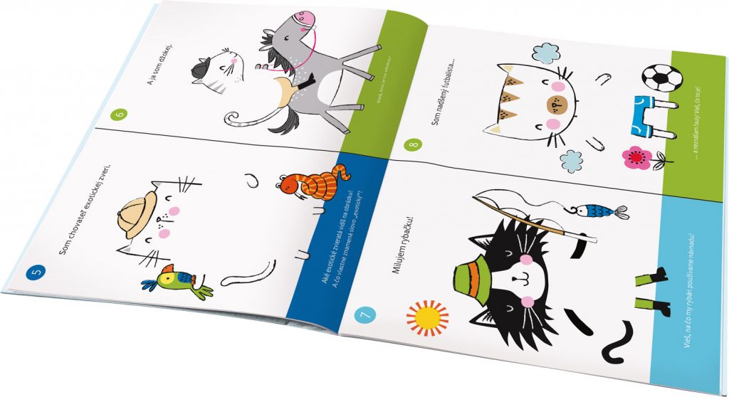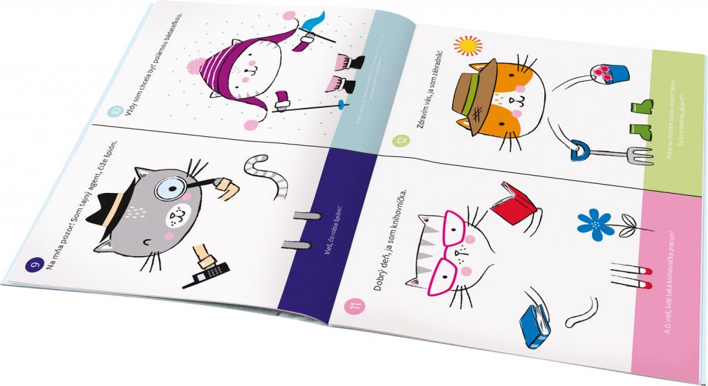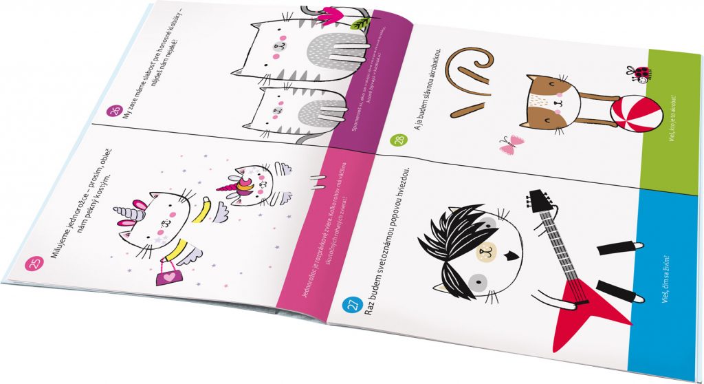 Pojmenujte roztomilé kočičky, vyberte správné samolepky a oblékněte je podle toho, co mají rády nebo čemu se věnují. A nezapomeňte zodpovědět naše otázky! Pokud si snad nebudete vědět rady, nic se neděje: v knížce najdete i správné odpovědi. Až z vás budou kočičí odborníci, můžete si nakreslit vlastní zvířátko a doplnit jeho obrázek vším, co potřebuje, aby bylo mezi ostatními spokojené. Třeba i nějakou záludnou otázkou a správnou odpovědí!