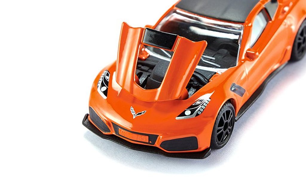 SIKU Blister – Chevrolet Corvette ZR1 s 6,2l motorem V8, výkonem 766 HP na zadní nápravu. 969 NM točivého momentu a při rychlé akceleraci vytvoří svými gumovými pneumatikami čáry na vozovce. Legendární americké vozidlo dosahuje maximální rychlosti 342 km/h. SIKU Z06 je proveden v oranžové barvě, která byla použita při představení modelu v roce 2018. Kapota auta je otevírací. Věk: 3+. Rozměr: 81 x 36 x 23 mm. Rozměr balení: 9,7 x 7,8 x 4 cm