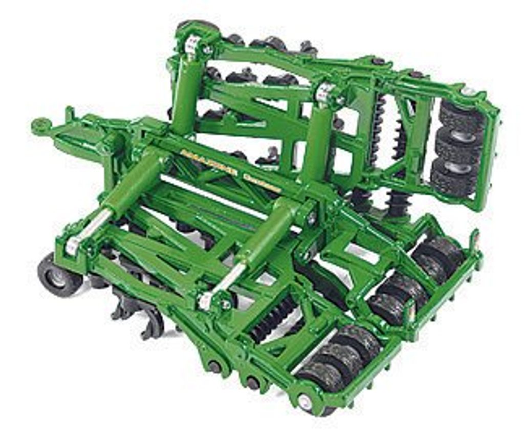 Kovový model zajímavého kloubového traktoru John Deere 9630 s dvojitými koly a víceúčelovými bránami Amazone. Model traktoru je propracován do jemných detailů včetně potisku. Zatáčení je realizováno pomocí kloubu uprostřed traktoru. Připojitelné brány Amazone lze zvednout do přepravní polohy nebo nechat sklopené v pracovní pozici. Všechna kola a válce bran jsou otočné. Model je vyroben z kovu a doplněn plastovými díly. Pneumatiky jsou gumové.