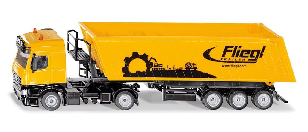 SIKU Super – Kamion s vyklápěcím přívěsem s nejnovější kabinou pro řidiče Mercedes-Actros a spoilerem jako dvounápravový kamion a přívěs. Třínápravový kamion s přívěsem se sklápěcí skříní od Fliegl má kovový podvozek. Sklápěcí žebřík s plošinou namontovanou na podvozku je vyroben z plastu. Pohyblivé opěrné patky a otevírací zadní klapka na sklápěcím přívěsu doplňují tento působivě výkonný nákladní vůz a přívěs vhodný pro staveniště a zemědělskou dopravu. Měřítko: 1:50. Rozměr: 275 x 188 x 59 mm. Rozměr balení: 31 x 6,5 x 11,5 cm. Věk: 3+
