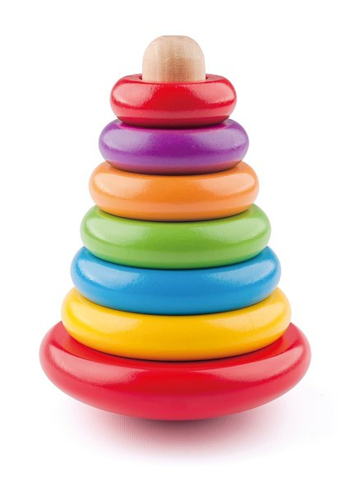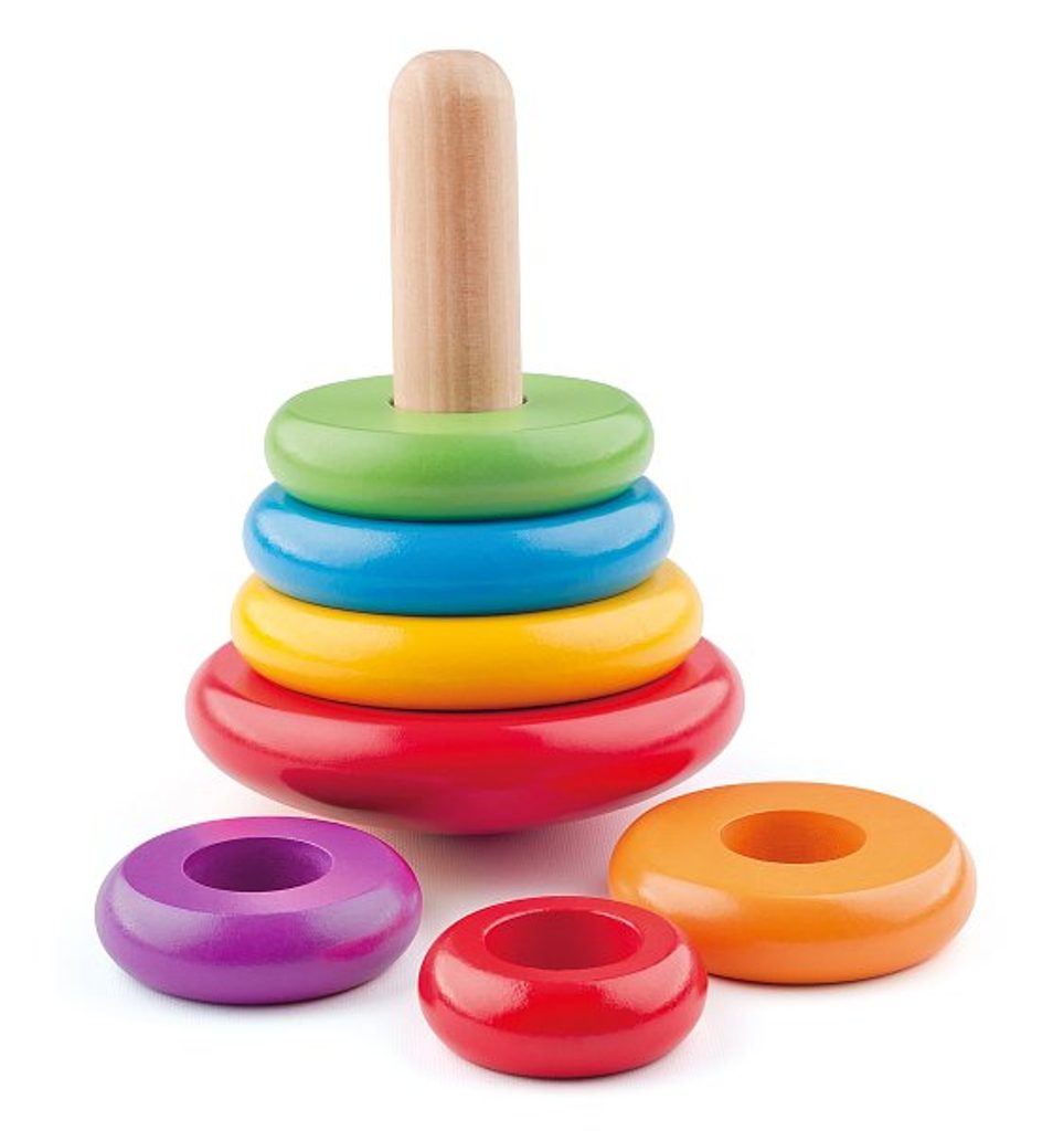 2. Development of logic and motor activity. Skládací pyramida a Káča v jednom. Různobarevné dřevěné kroužky se navlékají na tyčku od nějvětšího k nejmenšímu. Úkolem této hračky je rozvoj dětské motoriky. Navíc lze roztočit jako Káča. Věk: 18m+ Rozměr: 13 x 13 x 17cm