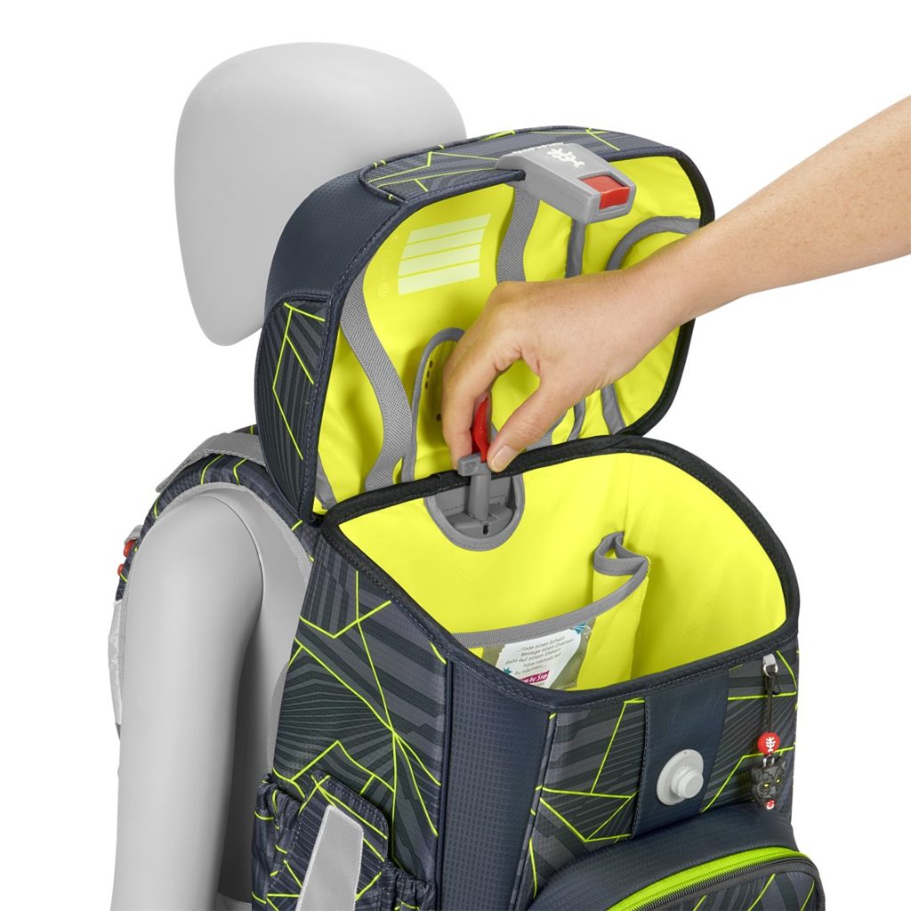 - možnost plynulého výškového nastavení ramenních popruhů pomocí otočného mechanismu uvnitř aktovky, zajišťuje přesné nastavení ramenních popruhů přímo na zádech dítěte