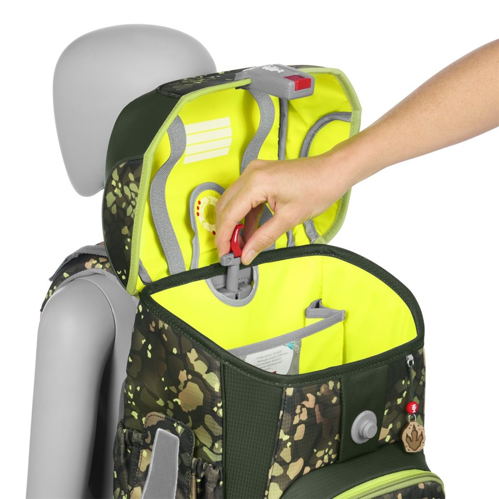- možnost plynulého výškového nastavení ramenních popruhů pomocí otočného mechanismu uvnitř aktovky, zajišťuje přesné nastavení ramenních popruhů přímo na zádech dítěte