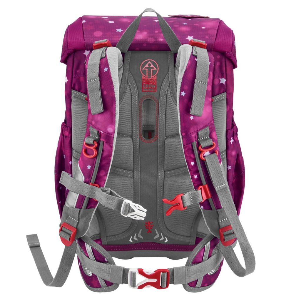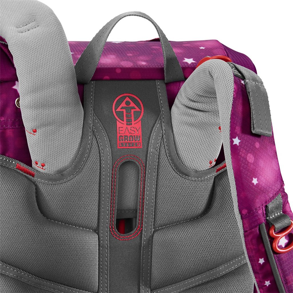 - možnost plynulého výškového nastavení ramenních popruhů pomocí otočného mechanismu uvnitř aktovky, zajišťuje přesné nastavení ramenních popruhů přímo na zádech dítěte