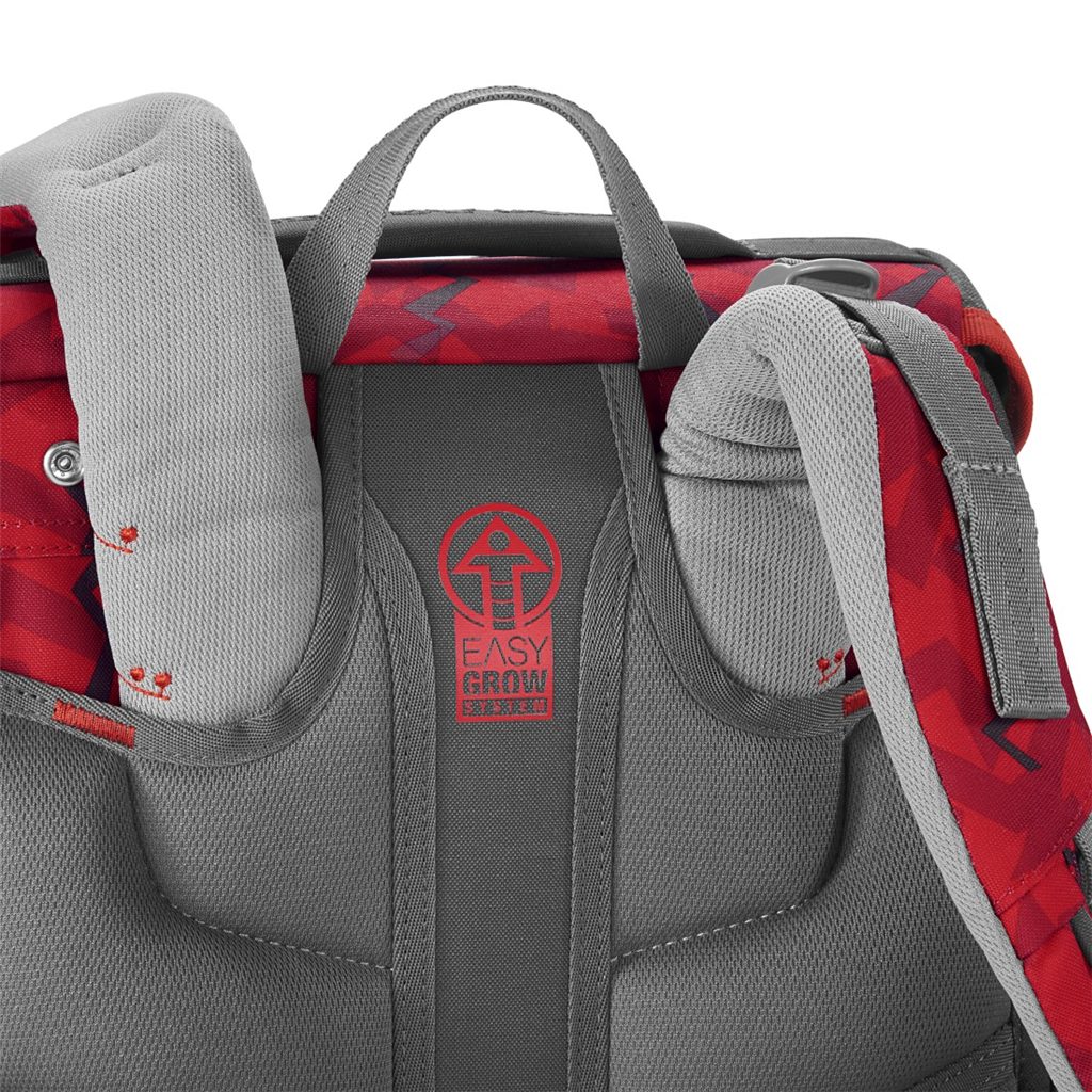 - možnost plynulého výškového nastavení ramenních popruhů pomocí otočného mechanismu uvnitř aktovky, zajišťuje přesné nastavení ramenních popruhů přímo na zádech dítěte