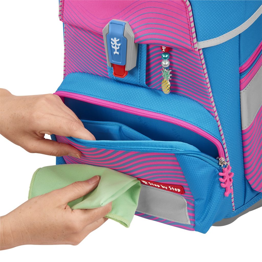 Velmi důležité je zdůraznit, že u výrobků Step by Step se dbá na nejvyšší kvalitu jak použitých materiálů tak i zpracování. Například reflexní plochy, které se nacházejí na každé straně aktovky (to aby byl školák viděn ze všech stran) jsou od značky Oralite (jedné z hlavních výrobců reflexních materiálů používaných na dopravních značkách a ve výrobě automobilů). Přezku u hrudního popruhu nám dodává japonský výrobce zipů a přezek firma YKK. A v neposlední řadě magnetické zavírání dodává značka Fidlock.