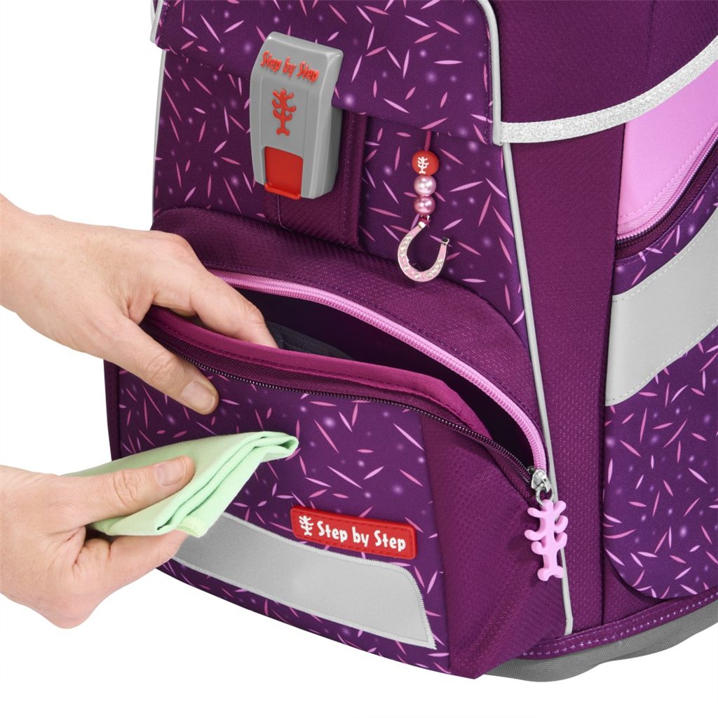 Velmi důležité je zdůraznit, že u výrobků Step by Step se dbá na nejvyšší kvalitu jak použitých materiálů tak i zpracování. Například reflexní plochy, které se nacházejí na každé straně aktovky (to aby byl školák viděn ze všech stran) jsou od značky Oralite (jedné z hlavních výrobců reflexních materiálů používaných na dopravních značkách a ve výrobě automobilů). Přezku u hrudního popruhu nám dodává japonský výrobce zipů a přezek firma YKK. A v neposlední řadě magnetické zavírání dodává značka Fidlock.