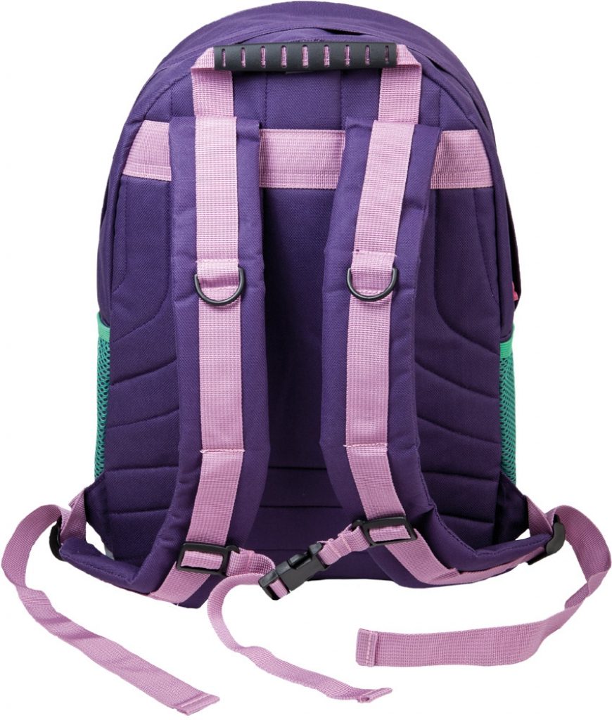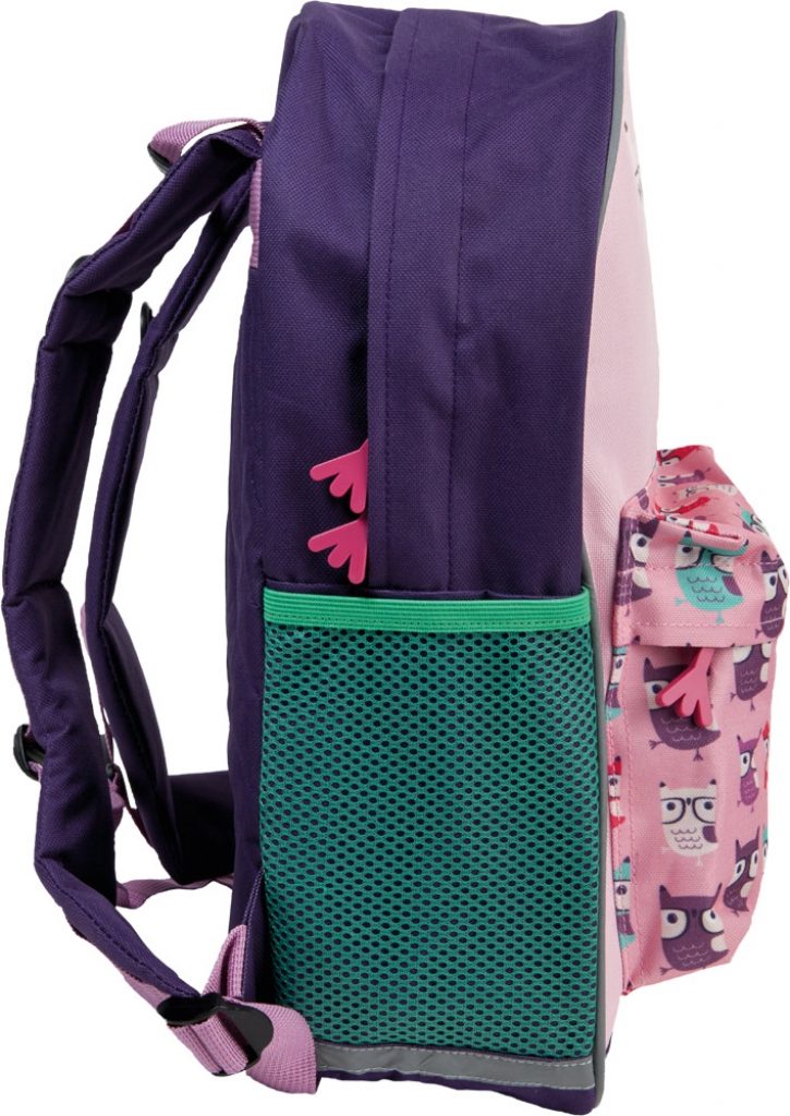 Školní batoh Sovy obsahuje hlavní přihrádku na notebook/tablet, dále přední kapsička a dvě boční síťované pro lahev.