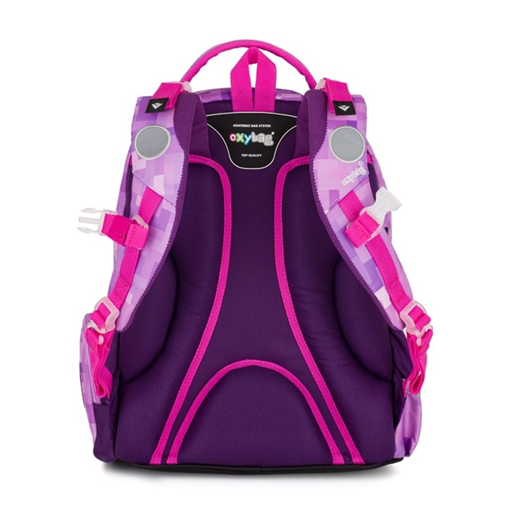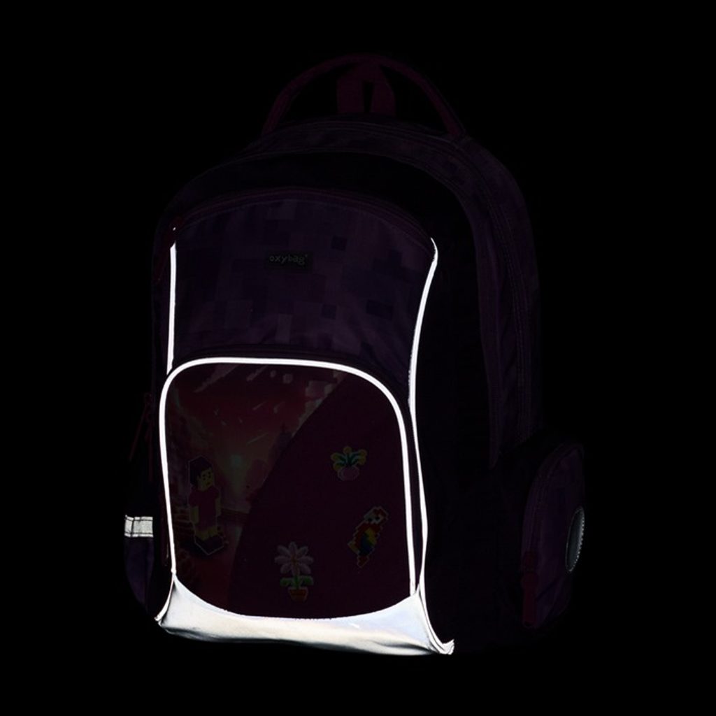 Školní batoh OXY GO zaujme moderním designem a promyšlenou funkčností. Má anatomicky tvarovaná, prodyšná záda a nastavitelné ramenní popruhy pro pohodlné nošení. Přidané háčky umožňují uchycení dlouhých popruhů. Vnitřní kapsy nabízí dostatek místa na učebnice, sešity i další potřeby, pevné nepromokavé dno chrání obsah před ušpiněním a protečením. Boční kapsy, jedna na zip a jedna otevřená, slouží např. na láhev. Reflexní prvky zajišťují bezpečnost. Batoh je ideální pro děti od 1. do 3. třídy vysoké od 125 cm. Délka zádového panelu je 39 cm, objem 22 l, hmotnost 930 g, nosnost 8 kg. Sáček: Praktický na cvičky nebo volnočasové aktivity, uzavírá se šňůrkami. Penál: Jednopatrový se dvěma chlopněmi, poutka na psací potřeby a průhledná fólie na rozvrh hodin.