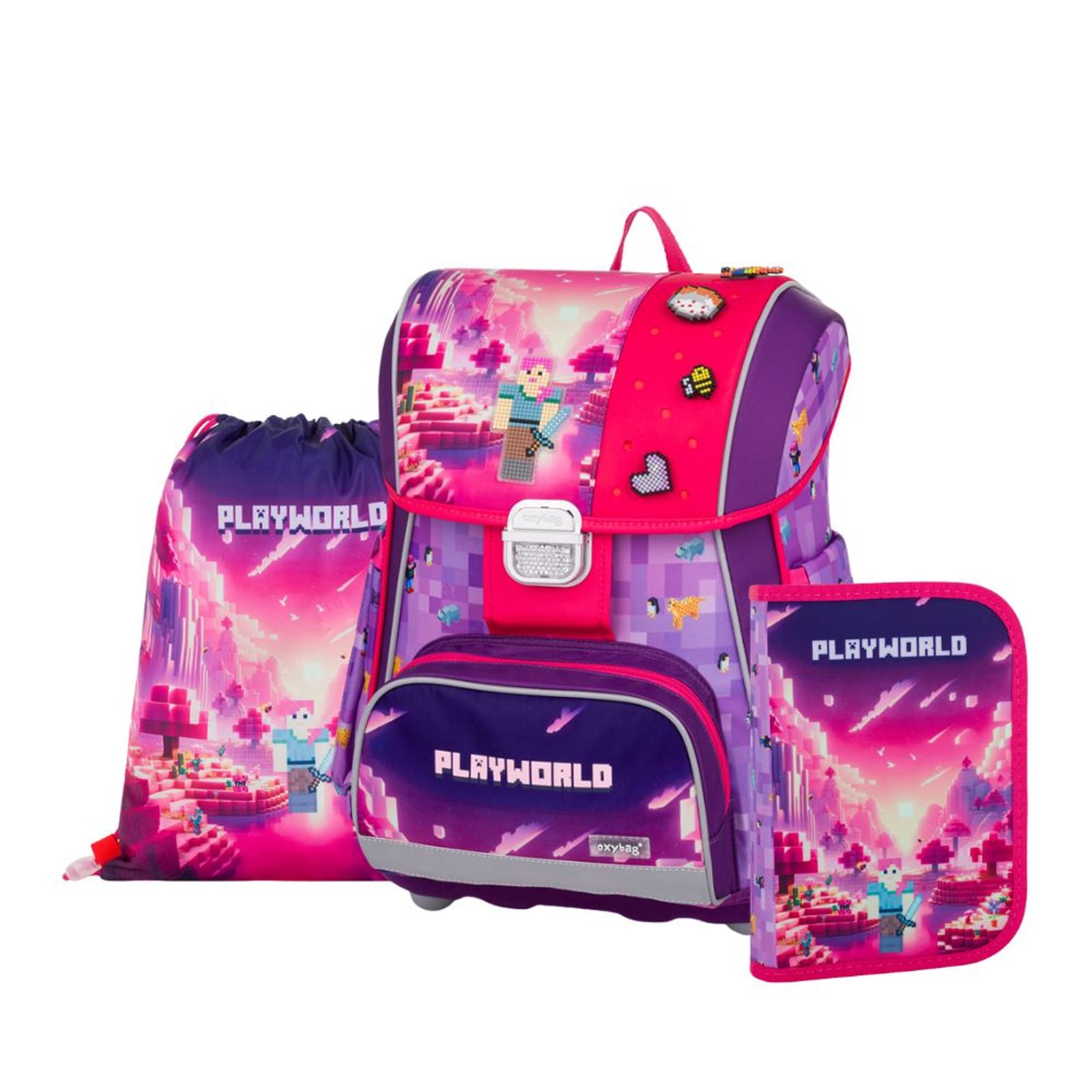 Aktovka: Školní aktovka z řady Premium je anatomicky tvarovaná a zajišťuje tak správné usazení na zádech. Vyztužená záda a vnitřní výztuha udržují stálý tvar batohu. Polstrování je z příjemného prodyšného materiálu, široké měkčené popruhy jsou navrženy tak, aby dokonale přilnuly a rovnoměrně zatížily ramena dítěte. Aktovka se skládá z jedné prostorné komory, kam se pohodlně vejdou všechny školní pomůcky pro děti v 1. a ve 2. třídě. Dno batohu je z pevného materiálu, chrání tím obsah před převržením a vysypáním. Zapínání je na bezpečnostní kovovou přezku s reflexní odrazkou. Přední kapsička je určena na svačinu, nechybí řada reflexních prvků, díky kterým je aktovka viditelnější. Délka zádového panelu: 33 cm. Objem: 27 l. Nosnost: 8 kg. Sáček: Praktický sáček na cvičky nebo přezůvky do školy. Uzavírá se snadno stažením šňůrek. Penál: Jednopatrový školní penál se dvěma chlopněmi bez náplně. Gumová poutka k uchycení psacích potřeb. Na vnitřní chlopni je průhledná fólie na rozvrh hodin.