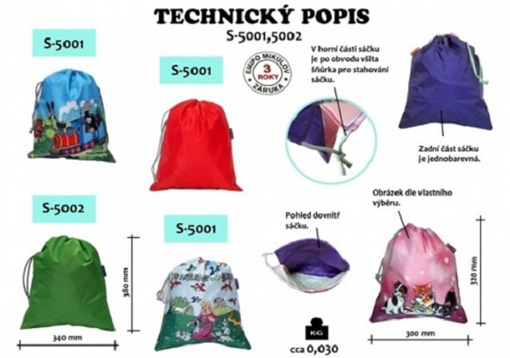 V horní části okraje sáčku je navlečena šňůrka na jeho stažení. Sáček se dá nosit jako batoh na zádech. Použitý textil má hydrofóbní úpravu.