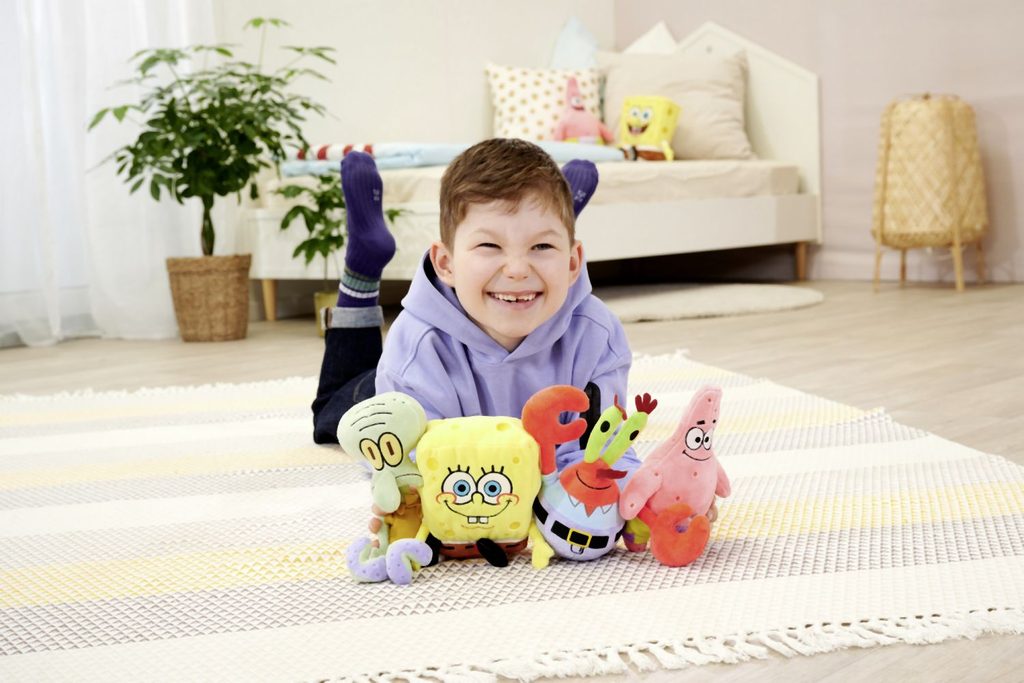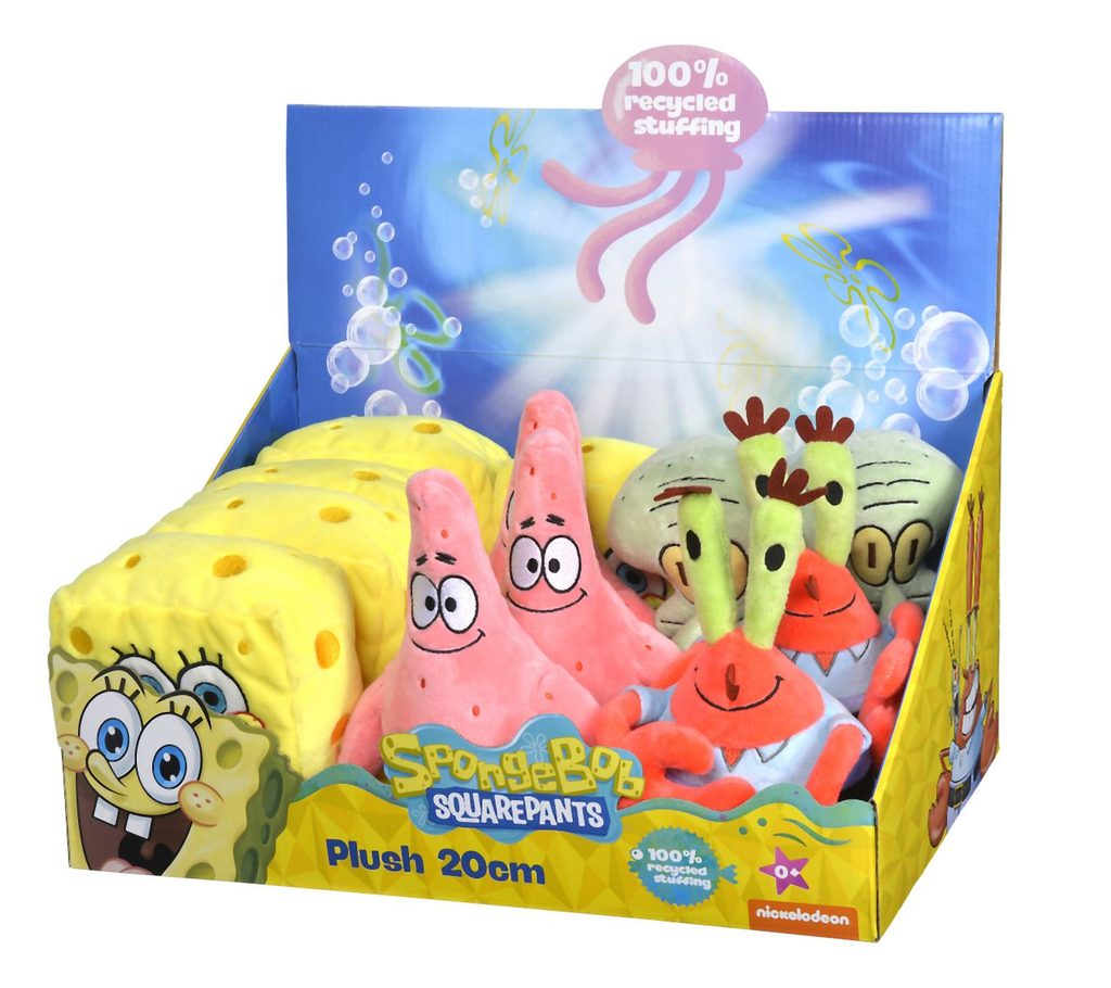 Plyšové postavy ze seriálu Spongebob v kalhotách 4 druhy - SpongeBob/Patrick/Sépiák/pan Krabs. S recyklovanou výplní v licenci Spongebob. Velikost 20 cm. Baleno v displeji po 12 kusech (5x Spongebob,…