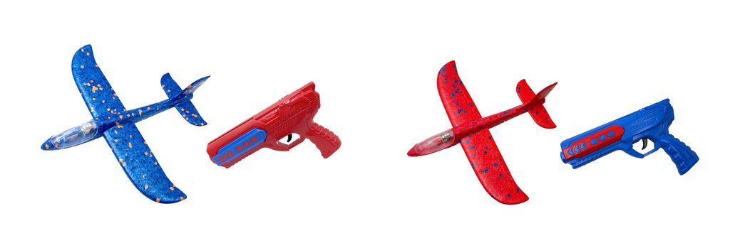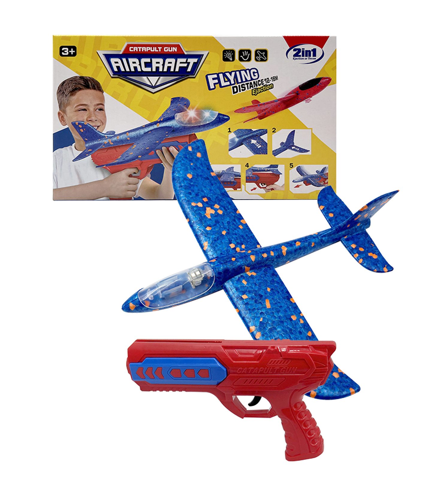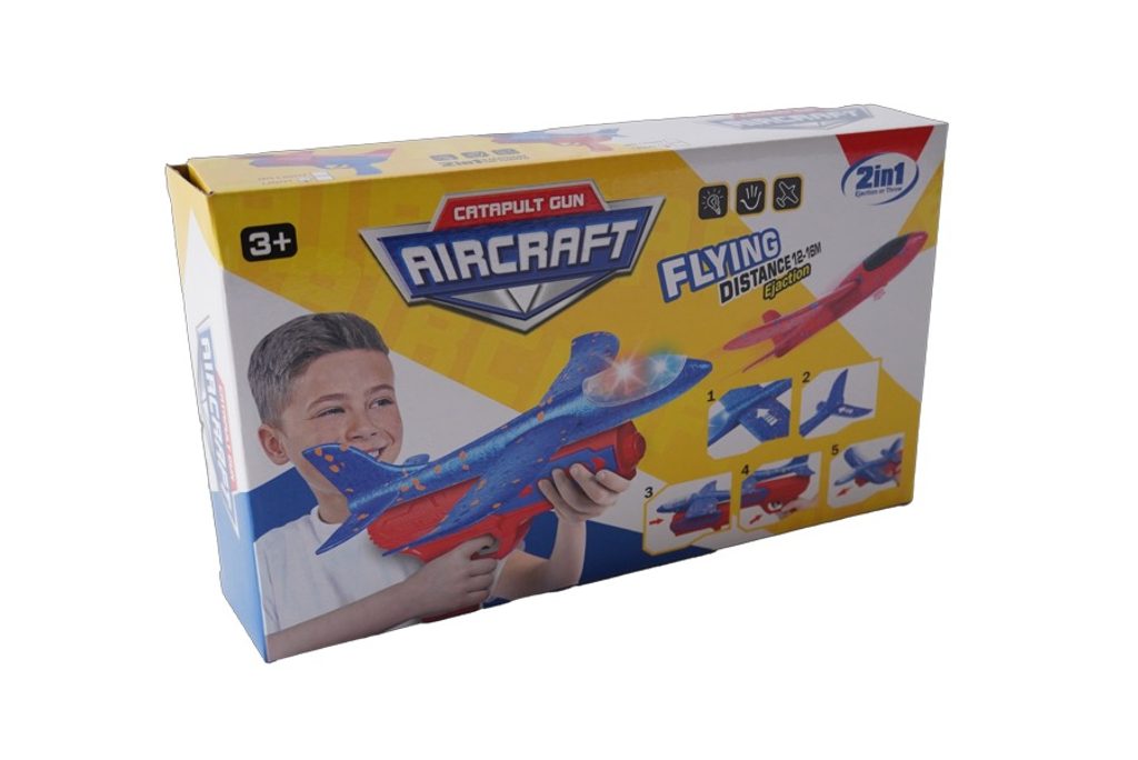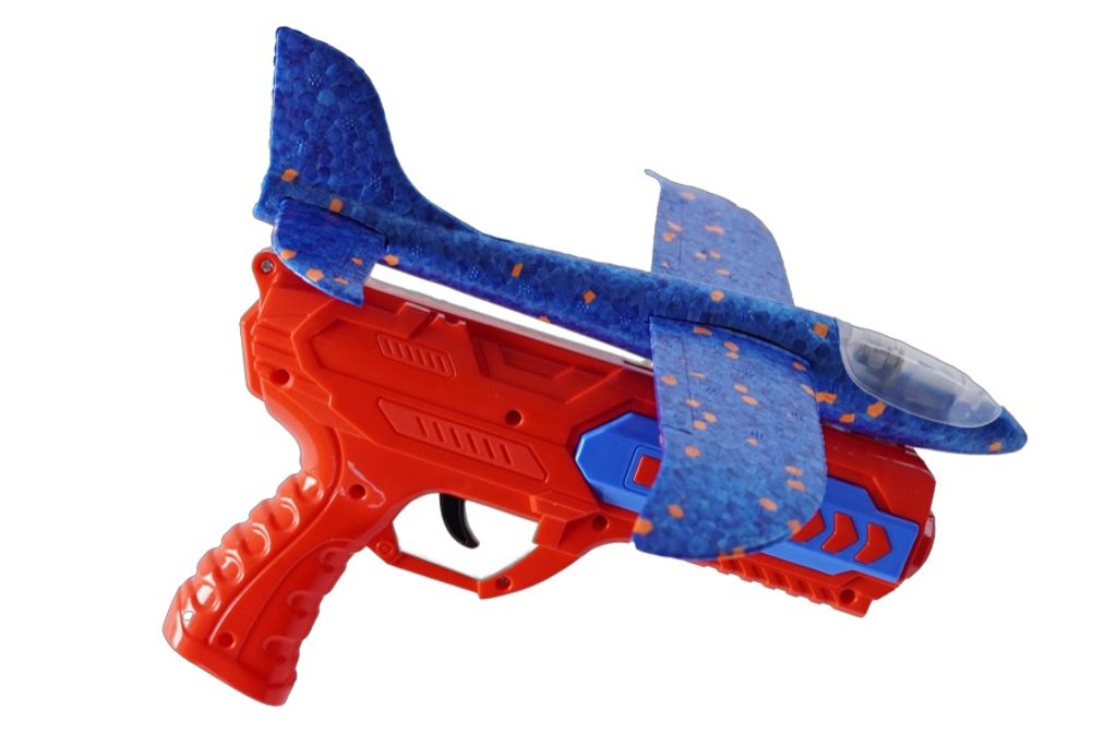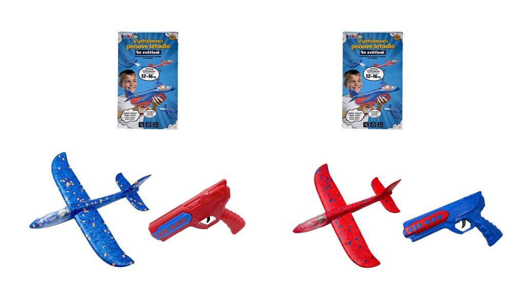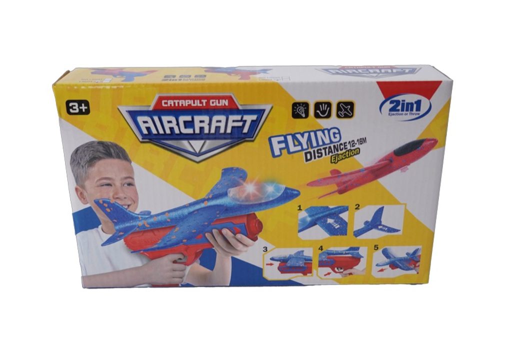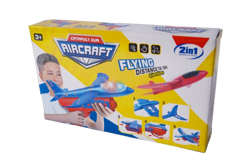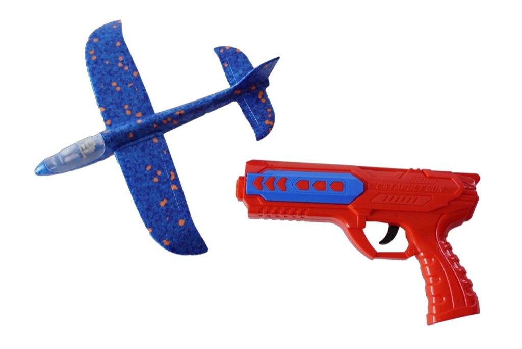 Pěnové letadlo s vystřelovací pistolí. Nasaď letadlo na pistoli a vystřel ho. Letado při letu svítí. Letadlo můžeš hodit i bez nasazení do pistole. Délka letu až 16 m.