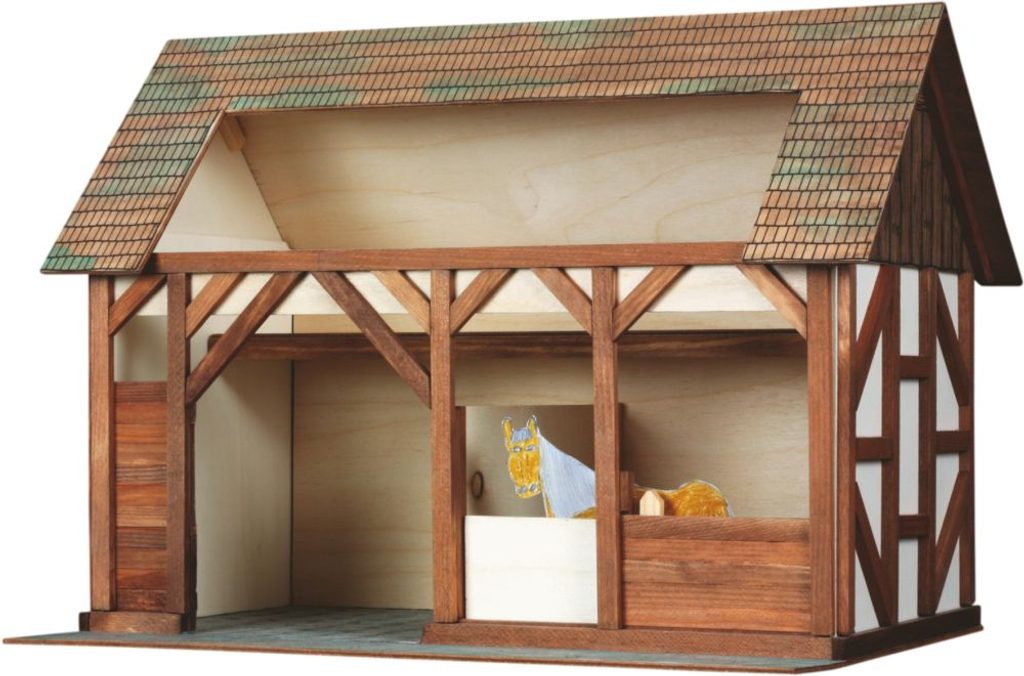 Dřevěná slepovací stavebnice Walachia - Stáj. Slepovací stavebnice Walachia jsou dřevěné modely domečků a staveb z Valašského kraje v měřítku 1:32. Základem jsou dřevěné hranolky 9x9 mm a k tomu jsou v sadě vždy všechny papírové doplňky - okna, dveře, střešní části atd. Pro lepení se používá lepidlo Herkules, není však součástí stavebnice. Přiložený je montážní návod a malé kapitoly z historie lidové architektury. Rozměry: 39 x 25 x 28 cm?Počet dílů stavebnice: 154