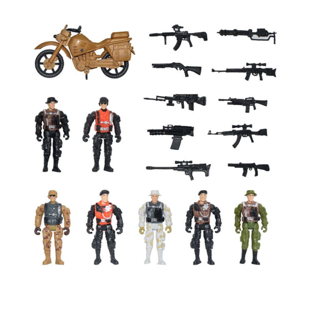 Sada vojáků s motorkou a zbraněmi.
