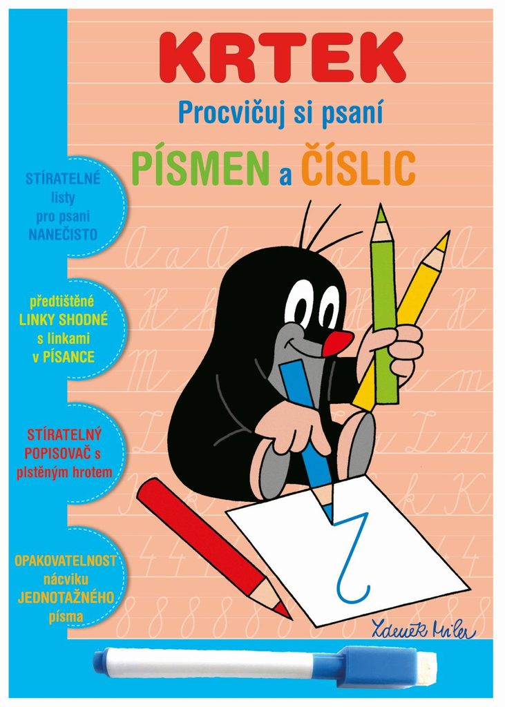 Stíratelný sešit "Procvičuj si písmena a číslice" + stíratelný popisovač - Krtek 1