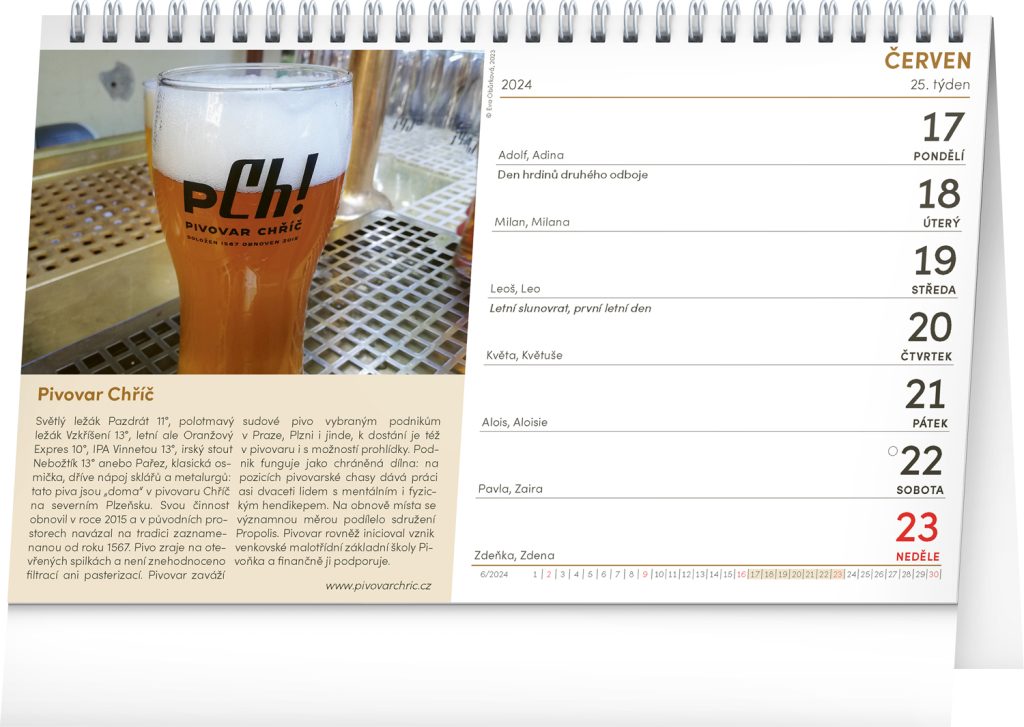 Máte rádi pivo a rádi objevujete zajímavé pivovary? Stolní kalendář plný tipů na cesty za zlatým mokem je tu právě pro vás. Dozvíte se, kde se u nás vaří ta nejznámější piva, ale i které malé pivovary byste měli při svých toulkách za pivem určitě navštívit. Týdenní kalendárium pro každého pivaře obsahuje také svátky, památné dny, fáze měsíce a přehled na celý rok 2024 a 2025.