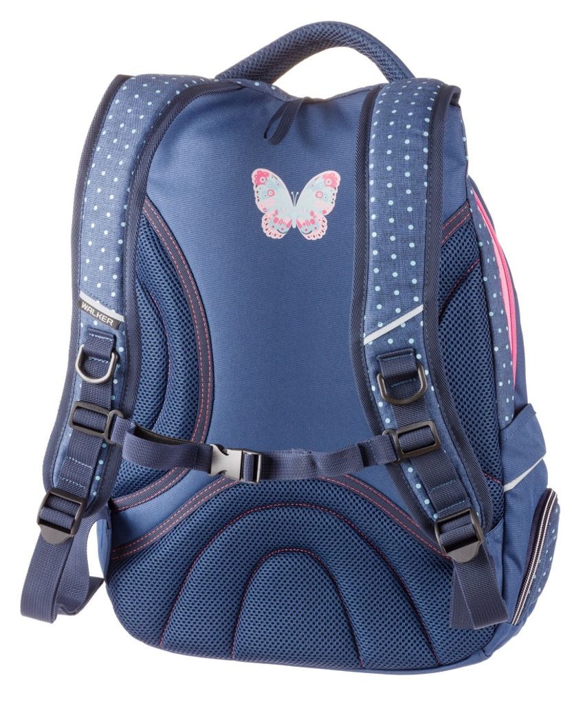 Studentský batoh WALKER FAME je dvoukomorový batoh s velkou přední kapsou uzavíranou na zip. Zadní komora má v horní části kapsičku na zip, na zadní části velkou otevřenou kapsu a vnitřní část je členěna zdvojenou přepážku, která tento prostor člení na tři samostatné části. Druhá komora je jednoduchá bez vnitřního členění. Přední velká kapsa má organizér navitý na kapse na zadní části. Organizér tvoří kapsička na mobil, síťovaná kapsička na zip a přihrádky na psací potřeby. V dolní části kapsy je reflexní paspule pro lepší viditelnost při špatných světelných podmínkách. Zádová část má ergonomické síťované polstrování. Široké nosné řemeny jsou opatřeny výškově nastavitelným spojovacím prsním páskem a reflexním páskem. V horní části je široké pevné madlo a vzadu pod ním poutko na pověšení. Po obou stranách jsou zdvojené kapsy s reflexní paspulí. Vnější menší kapsa je uzavíraná na zip, vnitřní větší je otevřená.