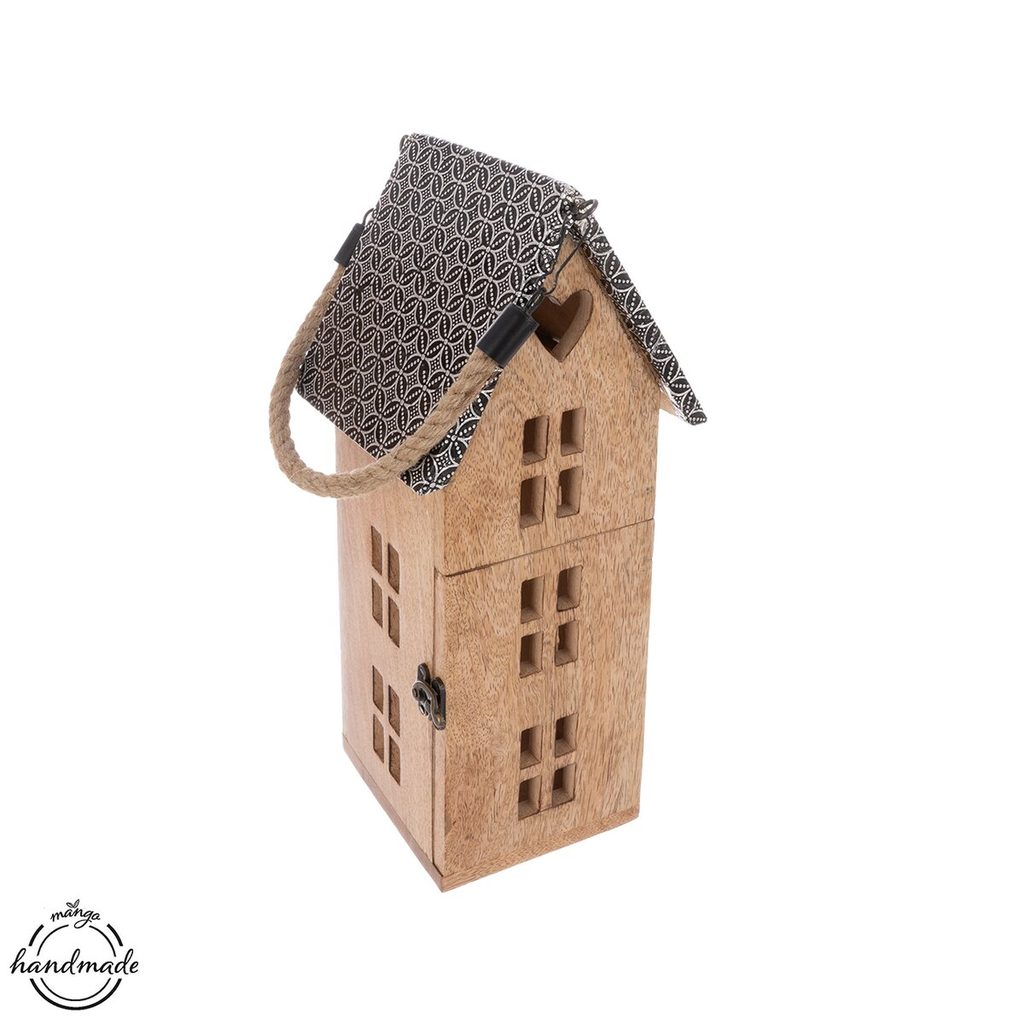 Svícen z mangového dřeva ve tvaru domečku bude krásným a stylovým prvkem interiéru během celého roku. Jeho přírodní materiál a originální design v podobě domečku dodají prostoru útulnou atmosféru. Je určen pro použití s LED svíčkou, jejíž jemné světlo krásně prosvítá okénky ven a vytváří příjemnou, útulnou atmosféru. Skvěle poslouží jako vkusný a nápaditý dárek. Materiál: mangové dřevo, kov, juta. Rozměry: 15x18x36 cm.