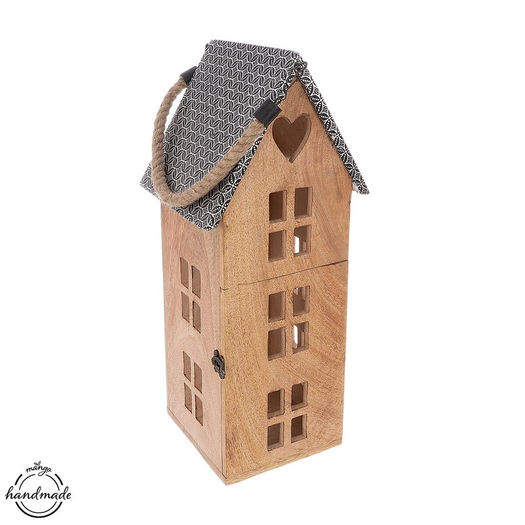 Svícen z mangového dřeva ve tvaru domečku bude krásným a stylovým prvkem interiéru během celého roku. Jeho přírodní materiál a originální design v podobě domečku dodají prostoru útulnou atmosféru. Je určen pro použití s LED svíčkou, jejíž jemné světlo krásně prosvítá okénky ven a vytváří příjemnou, útulnou atmosféru. Skvěle poslouží jako vkusný a nápaditý dárek. Materiál: mangové dřevo, kov, juta. Rozměry: 20,5x22x48,5 cm.