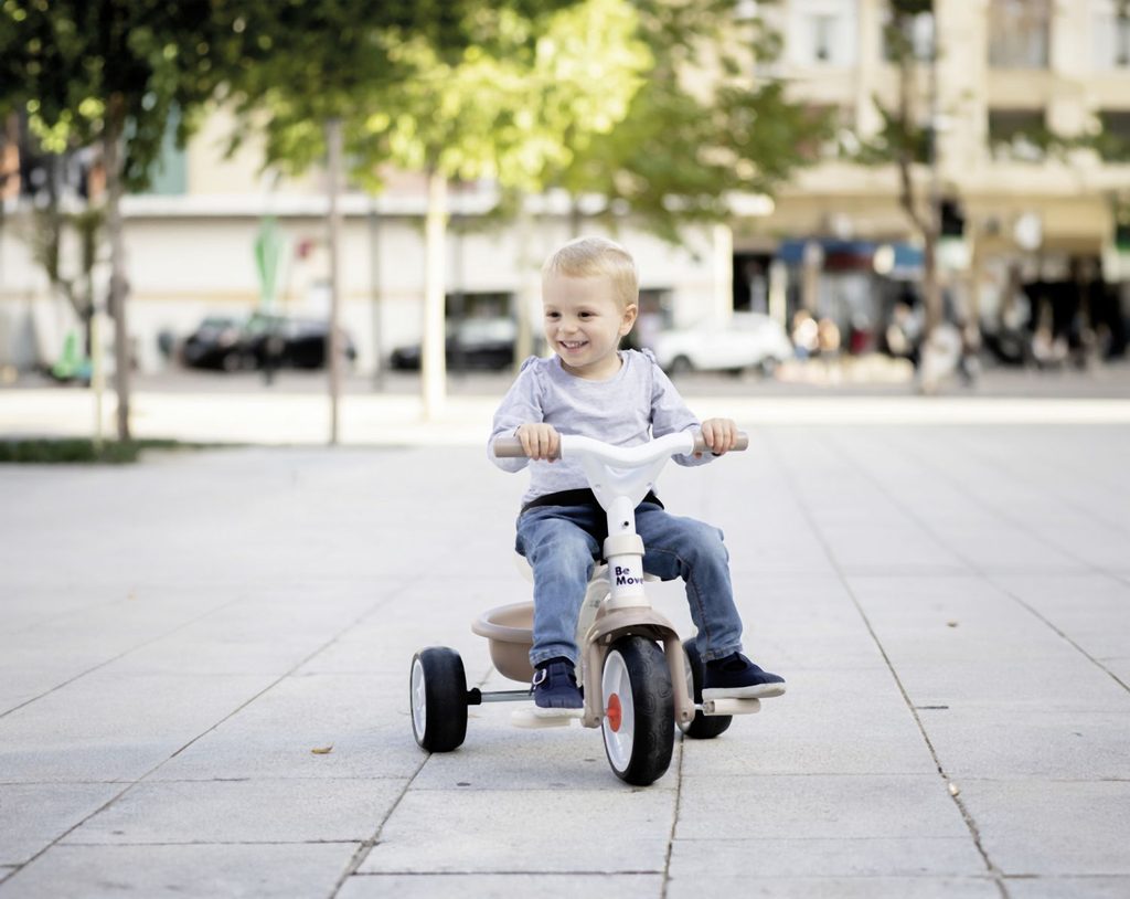 Šlapací tříkolka pro kluky i holčičky v béžové barvě má kovový rám, nastavitelnou a odnímatelnou vodící tyč (3 výškové úrovně, max. 95 cm), protiskluzové pedály s možností zablokování šlapání, nastavitelné ergonomické sedadlo na 2 pozice, bezpečnostní pás, výklopný plastový košík a tichá kolečka. Rozměry: 68 x 52 x 52 cm. Hmotnost: 3,479 kg.