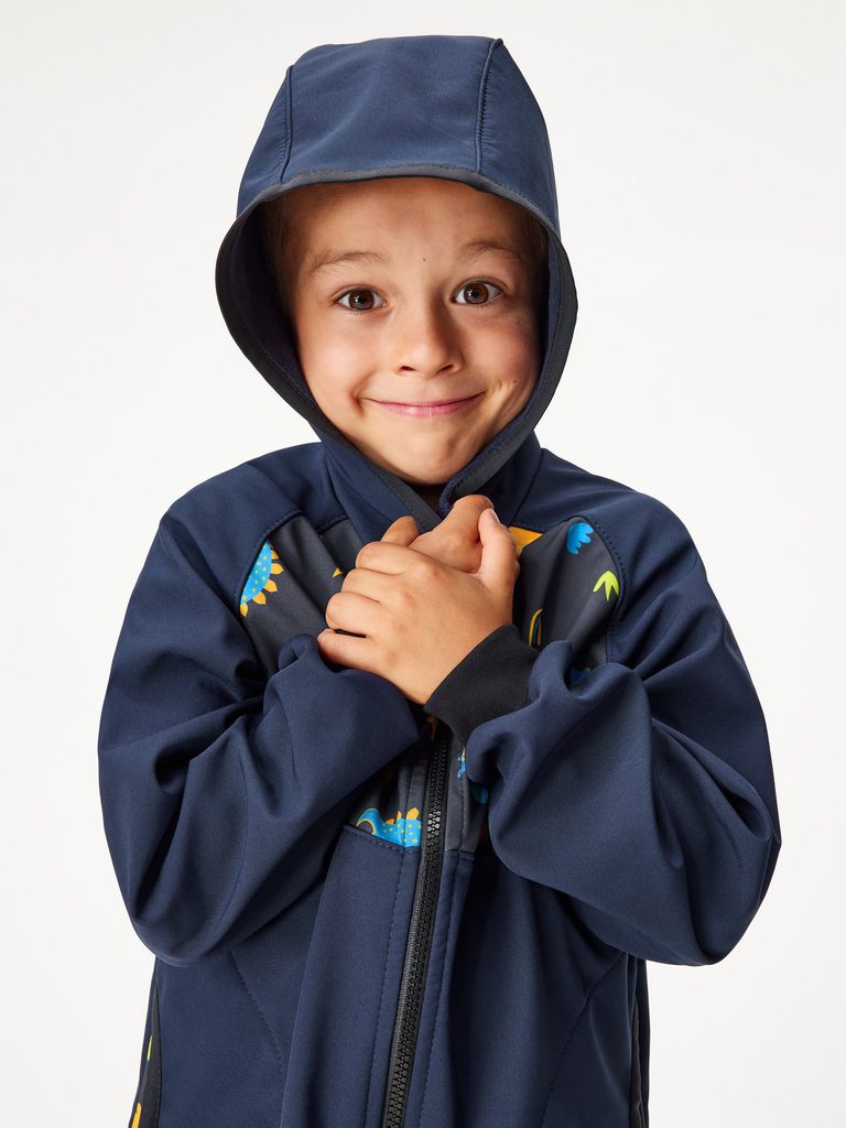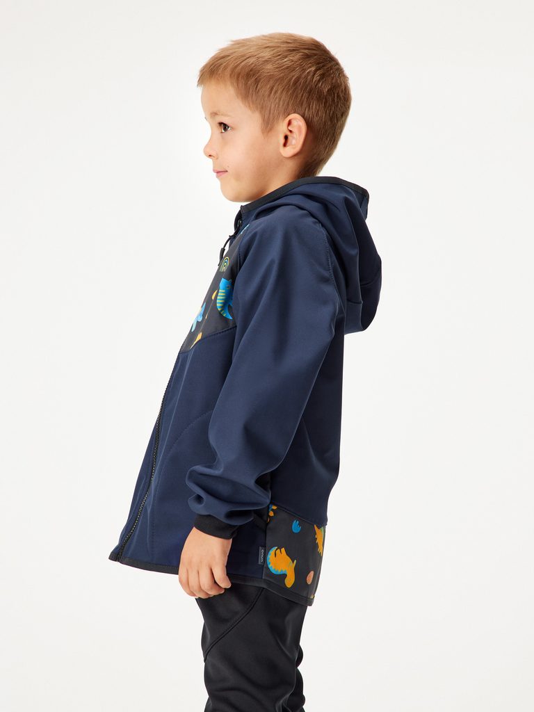 Unuo, Dětská softshellová bunda s fleecem Basic, Tm. Modročerná, Dinosauři