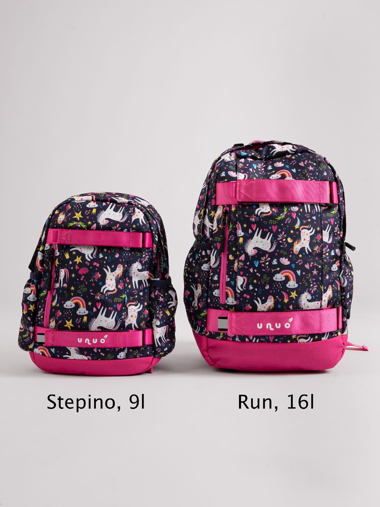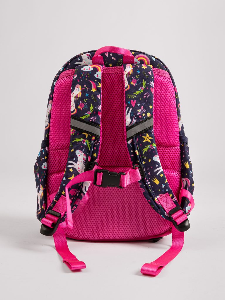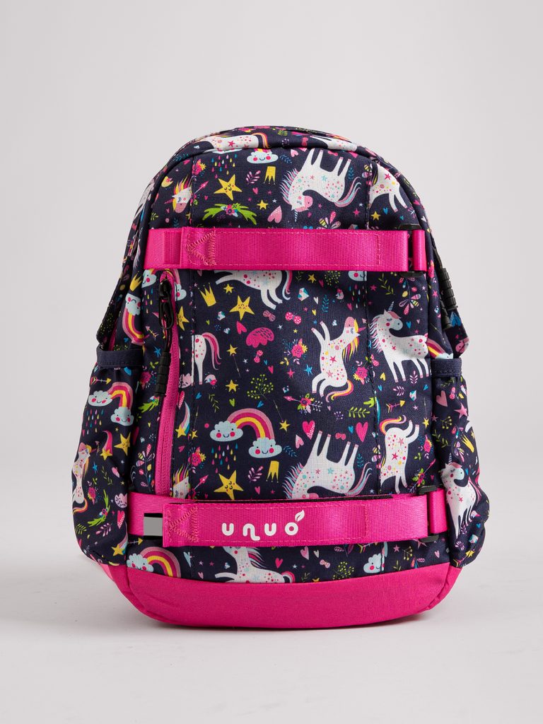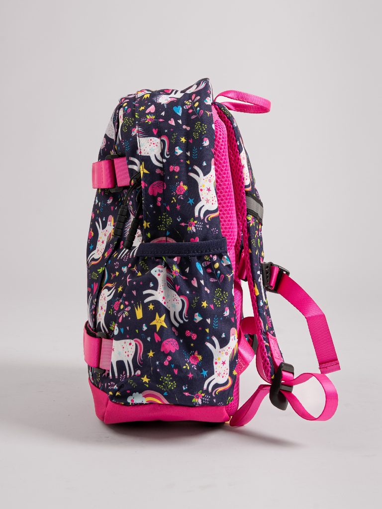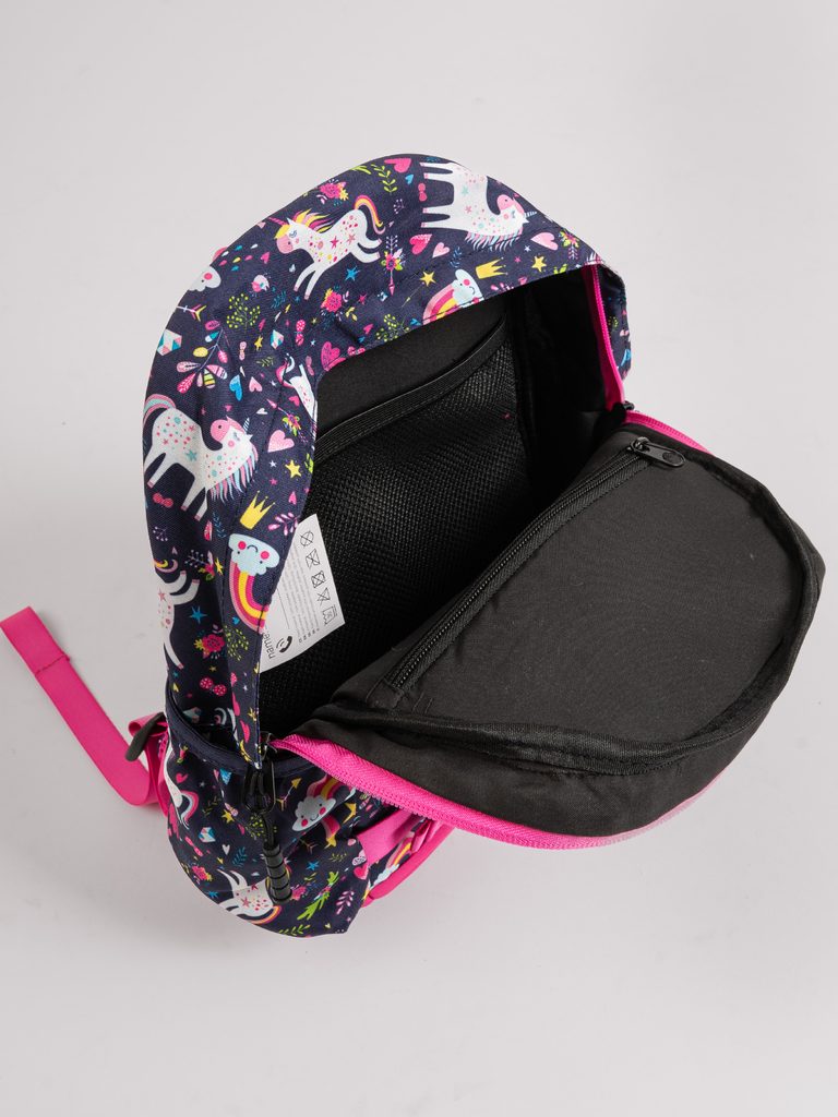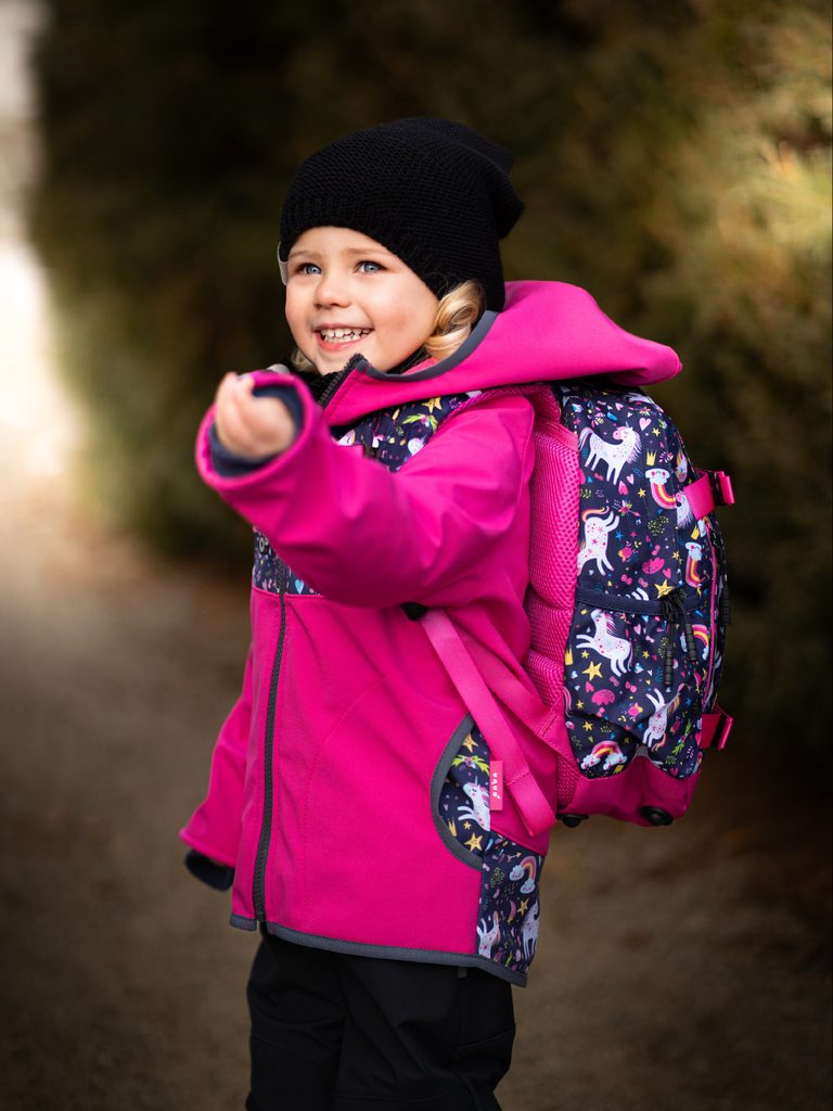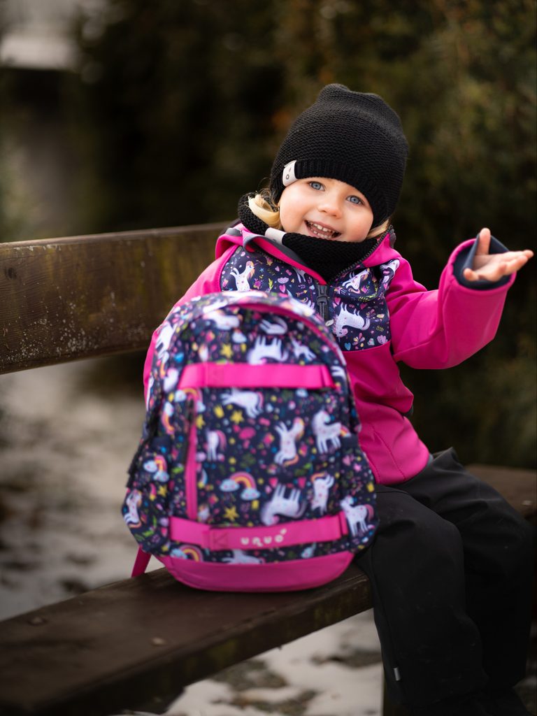 Batoh je vybaven polstrovanými zády a nastavitelnými ramenními popruhy, což zajišťuje pohodlné nošení, zatímco prsní pás poskytuje dodatečnou podporu a stabilitu při nošení všech nezbytností. Uvnitř najdete prostornou kapsu pro knížky, svačiny a oblíbené hračky, zatímco malá zipová kapsa na vnějšku usnadní rychlý přístup ke všem drobnostem. Boční kapsa na láhev pomůže udržet dostatečný příjem tekutin vašich dětí během dne.