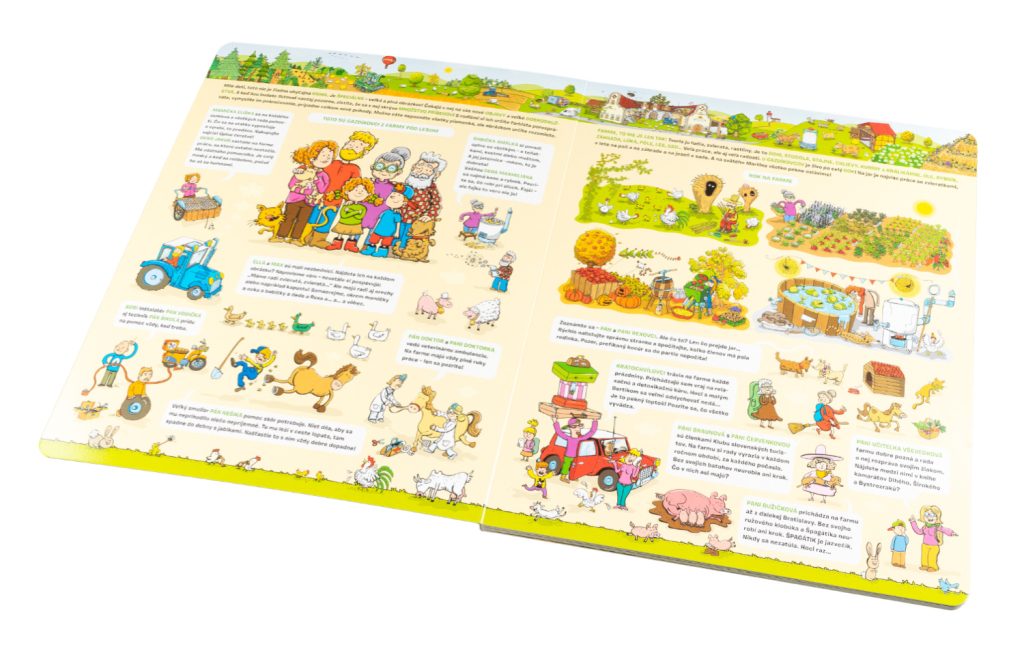 Poznáte život na farmě OD JARA DO ZIMY. Odkud se bere mléko a vajíčka? Z čeho se vyrábí svetr? K čemu je dobré obilí? Co všechno je třeba, aby zelenina a bylinky dobře rostly? Jak se pletou košíky? Jaké dobroty se dají získat z obyčejného jablíčka? A víte, že včelky nedávají jenom žihadla?