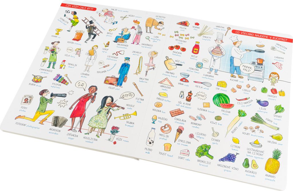 Tato velká obrázková knížka s veselými barevnými a „čtivými“ ilustracemi může malé čtenáře provázet celým předškolním obdobím a možná ještě déle... Nabízí nepřeberné možnosti využití. Dítě se nejprve učí poznávat a pojmenovávat jednotlivé předměty na obrázcích, později si pak zapamatovává tištěnou podobu slov. Ti nejmenší se podle ní mohou učit rozpoznávat barvy, starším poslouží jako podklad pro první čtení, případně psaní tiskacích písmen. Může vás dále inspirovat k nejrůznějším hrám na procvičování krátkodobé paměti a také ukrývá spousty příběhů – obrázky stačí jen pospojovat do dějové linky – fantazii se meze nekladou! A pro ty nejzvídavější jsou tu dokonce všechna slovíčka přeložená do angličtiny – a učení i hry mohou začít nanovo!