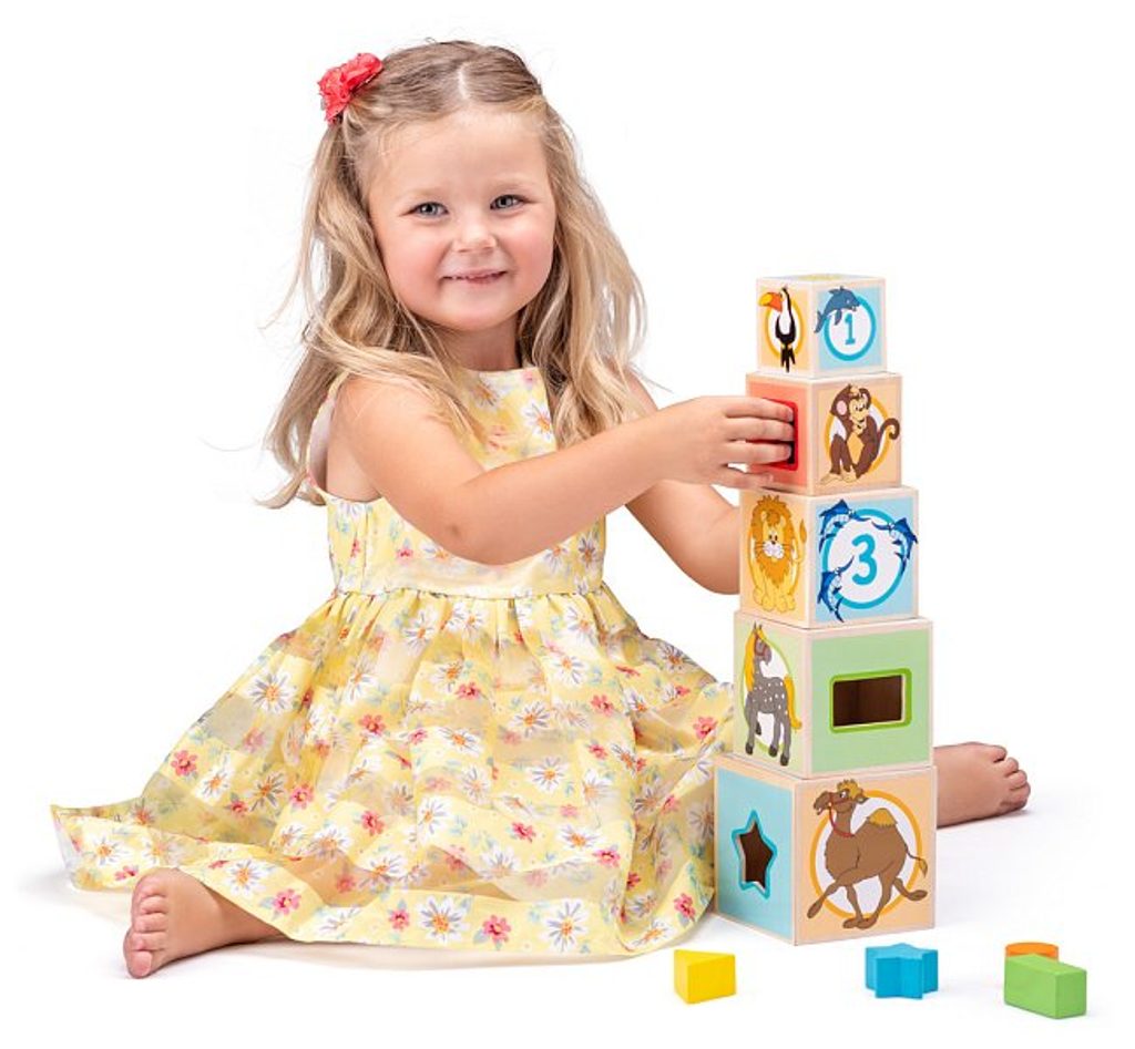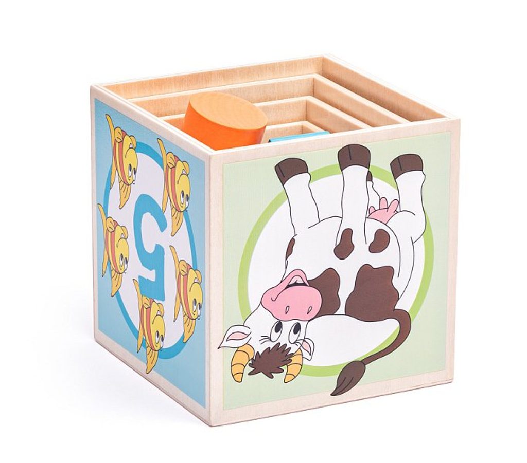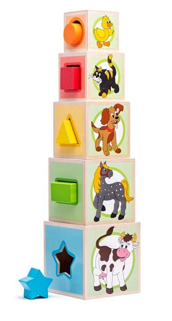 Pět kostek, které se dají skládat na sebe i do sebe má několik funkcí. Každá z kostek má na jedné straně vyříznutý tvarový otvor, do kterého se vkládá kostička příslušného tvaru a barvy. Na dalších stěnách jsou obrázky s různým počtem zvířátek, který odpovídá číslici na vedlejší straně kostky.